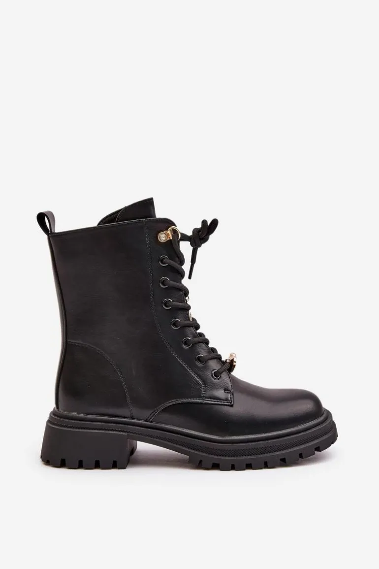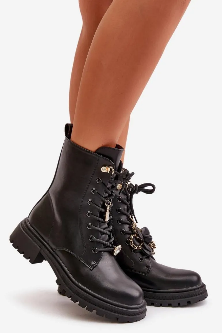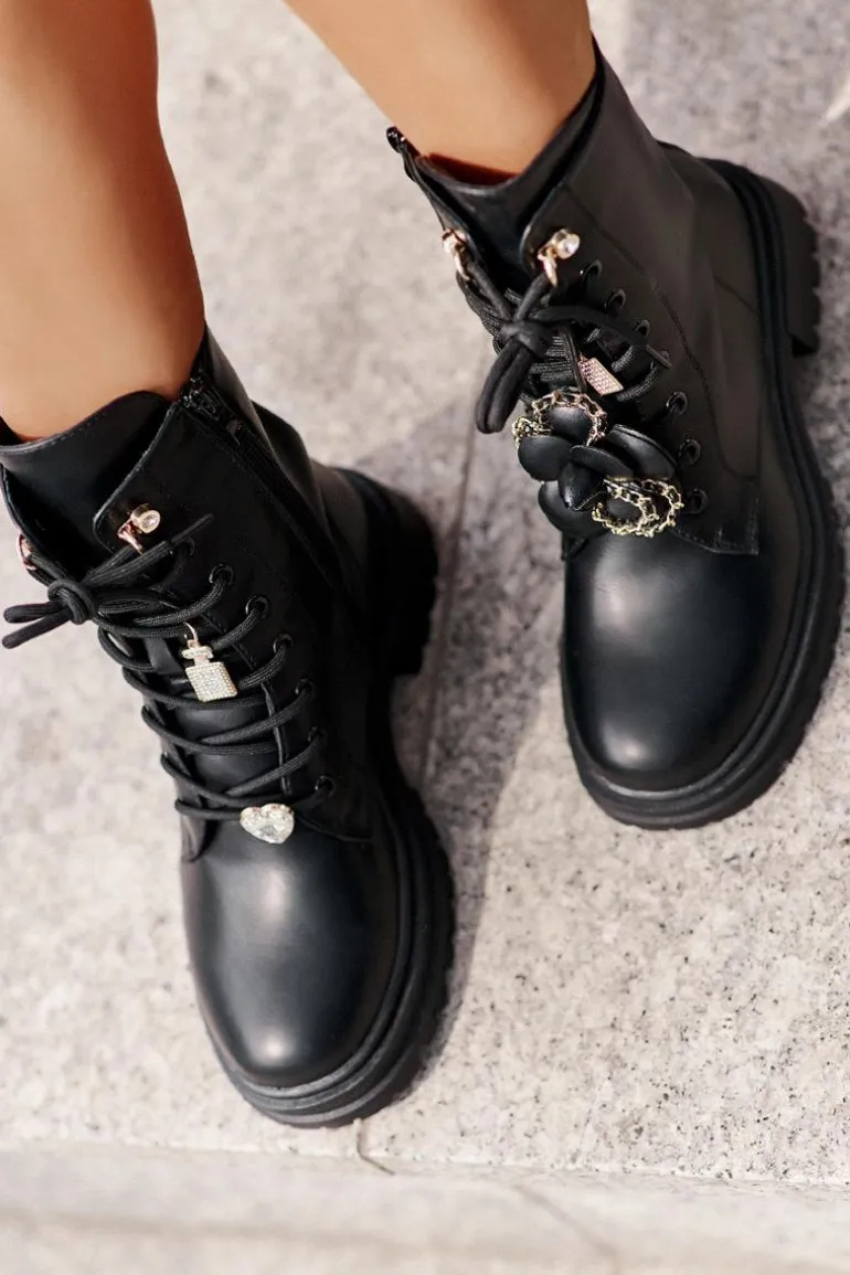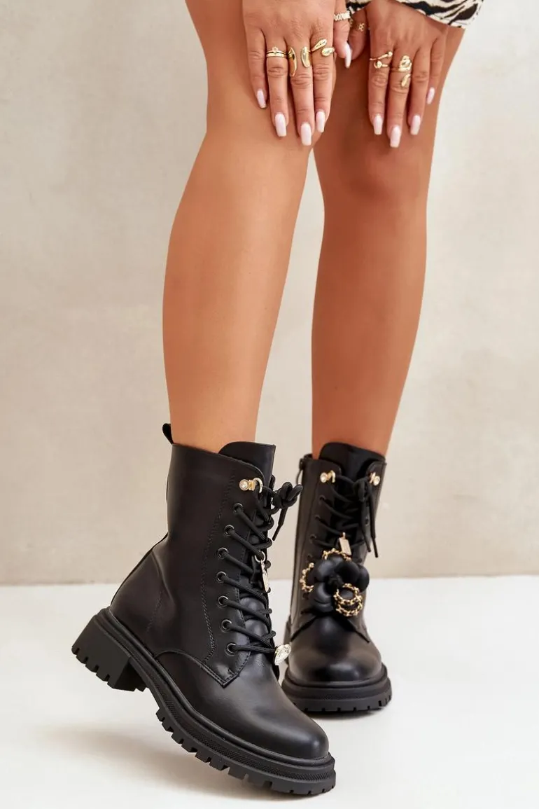 Damskie botki wykonane z ekologicznej skóry. Osadzone na płaskim obcasie. Noski zaokrąglone. Zapinane na suwak z boku dla łatwego zakładania, a dodatkowe sznurowanie z uroczymi przypinkami dodaje im wyjątkowego uroku. Idealne na jesienne i zimowe stylizacje, świetnie komponują się z różnymi zestawami na chłodniejsze dni. Przy wyborze rozmiaru prosimy sugerować się tabelą rozmiarów.