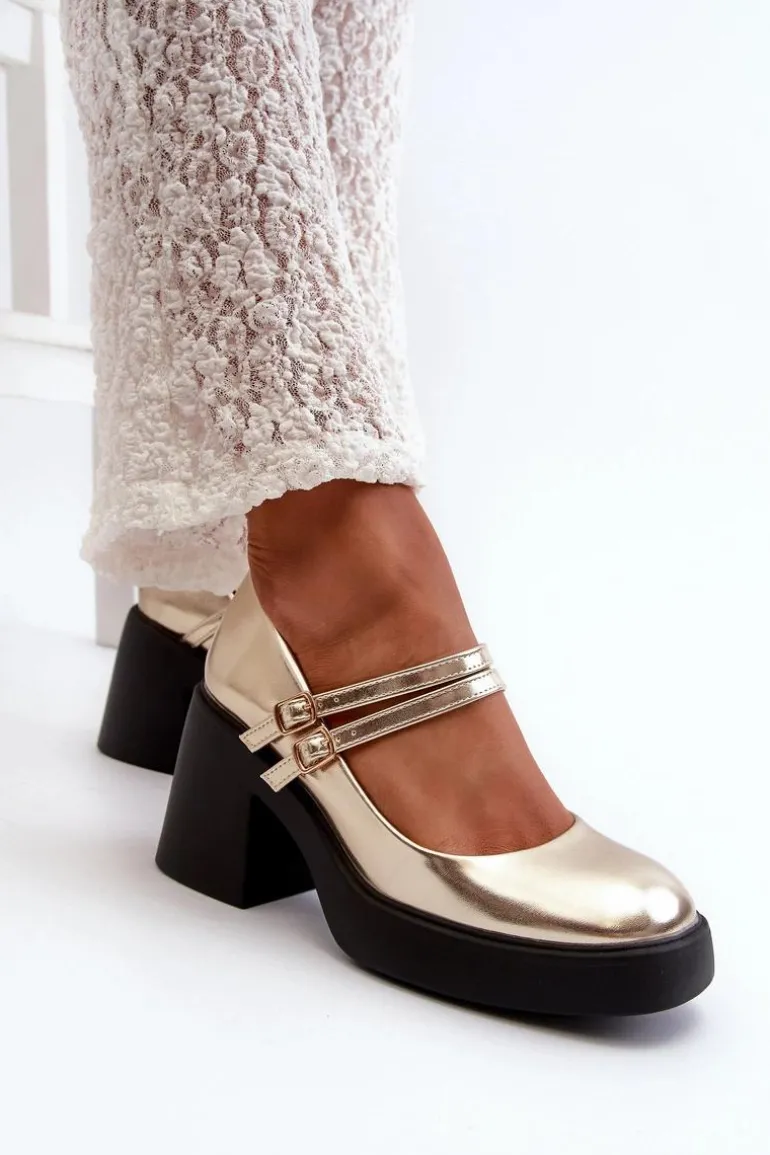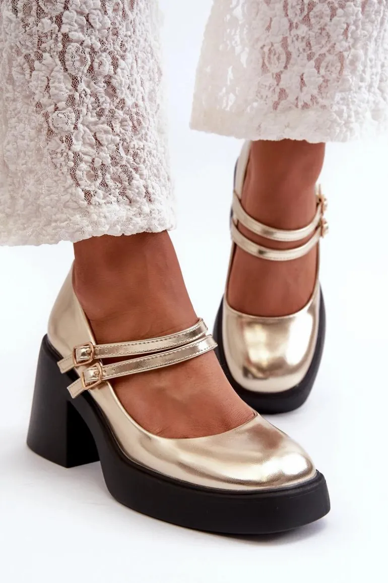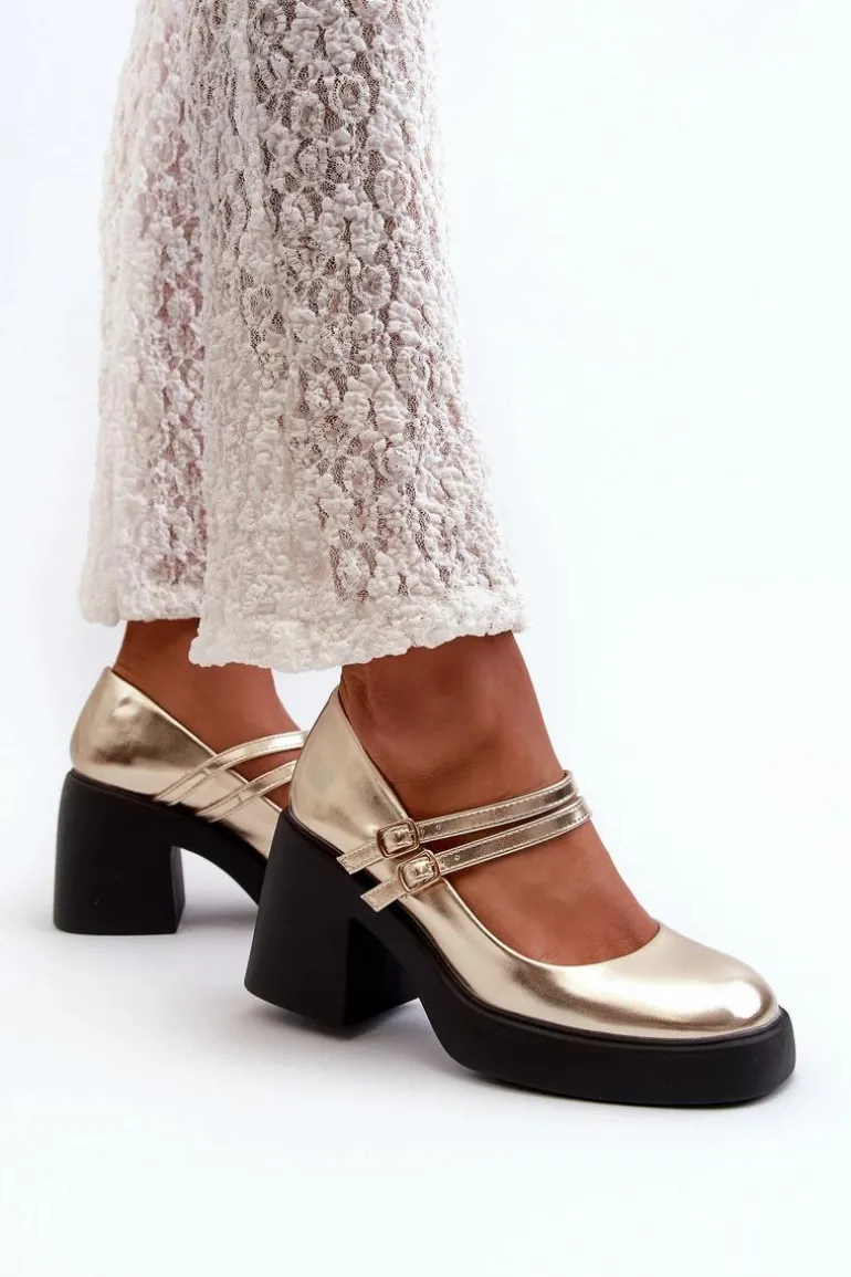 Czółenka wykonane ze skóry ekologicznej. Zapinane na dwa regulowane, cienkie, paseczki. Osadzone na masywnym, wyższym obcasie w postaci klocka. Zapiętek jest usztywniany, a nosek kwadratowy. Dodatkowo buty posiadają delikatną platformę. Ten modny fason koniecznie musi być Twój! Przy wyborze rozmiaru prosimy sugerować się tabelą rozmiarów.
