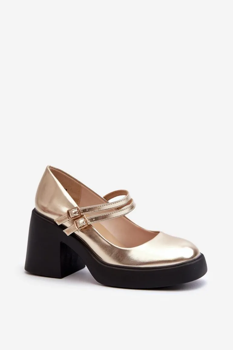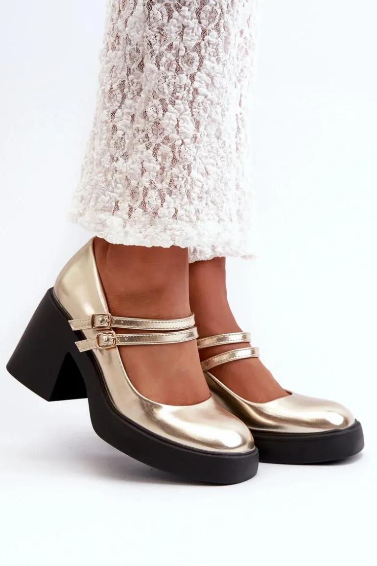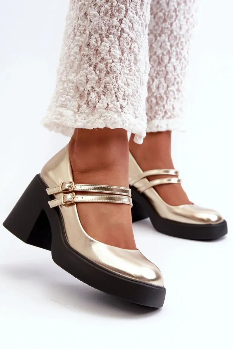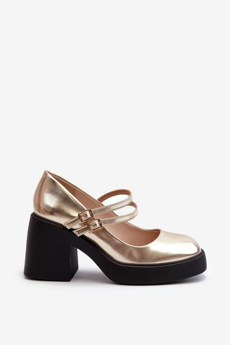 Czółenka wykonane ze skóry ekologicznej. Zapinane na dwa regulowane, cienkie, paseczki. Osadzone na masywnym, wyższym obcasie w postaci klocka. Zapiętek jest usztywniany, a nosek kwadratowy. Dodatkowo buty posiadają delikatną platformę. Ten modny fason koniecznie musi być Twój! Przy wyborze rozmiaru prosimy sugerować się tabelą rozmiarów.