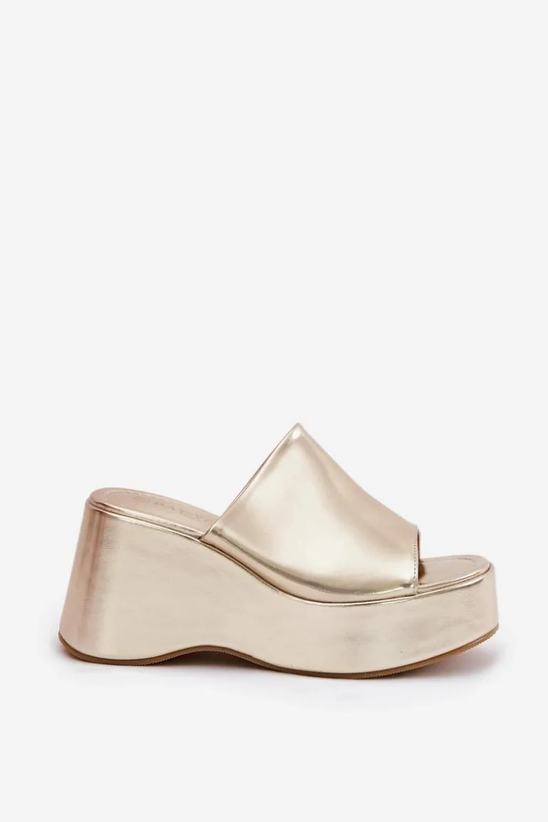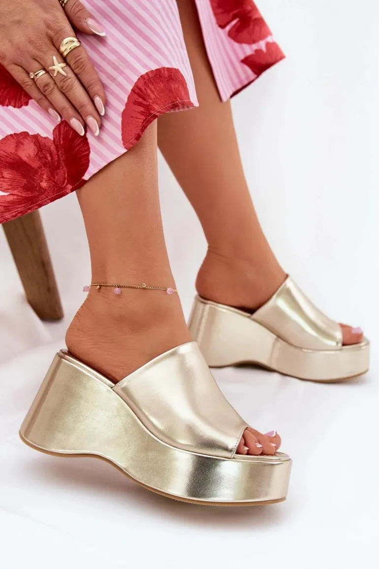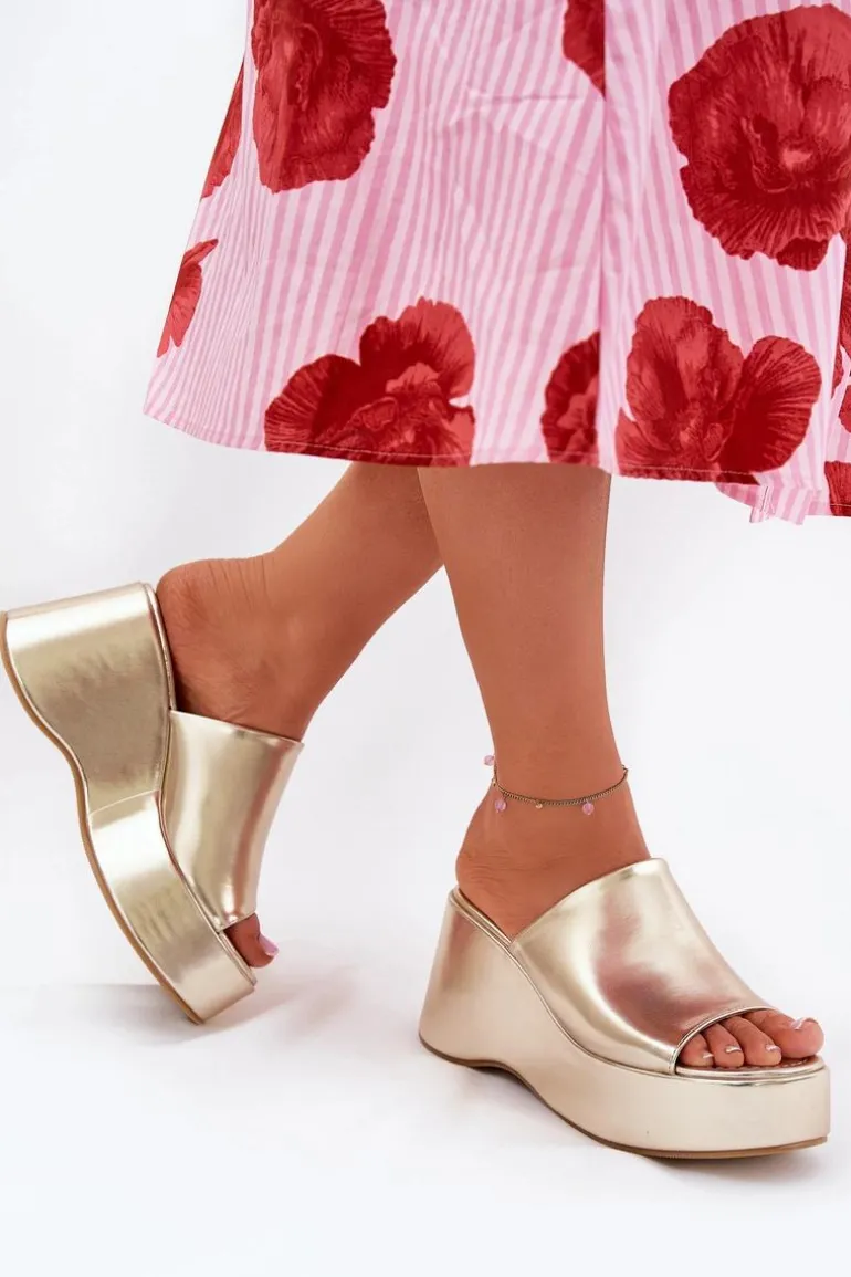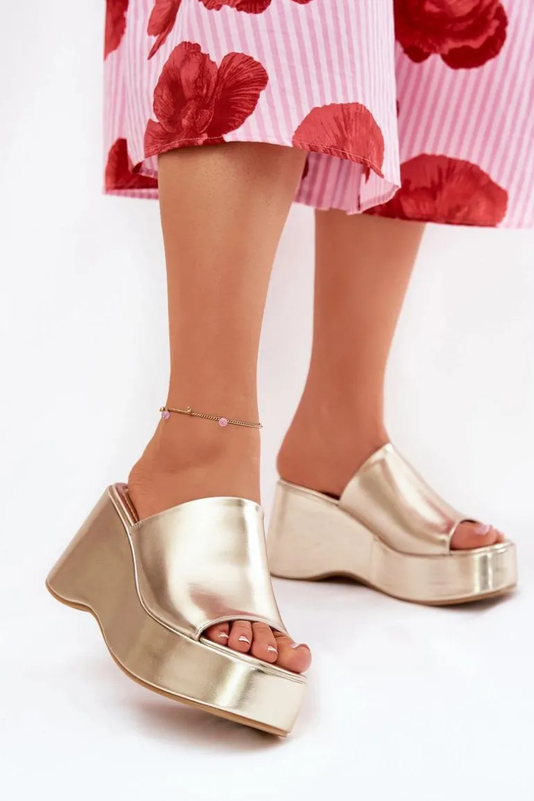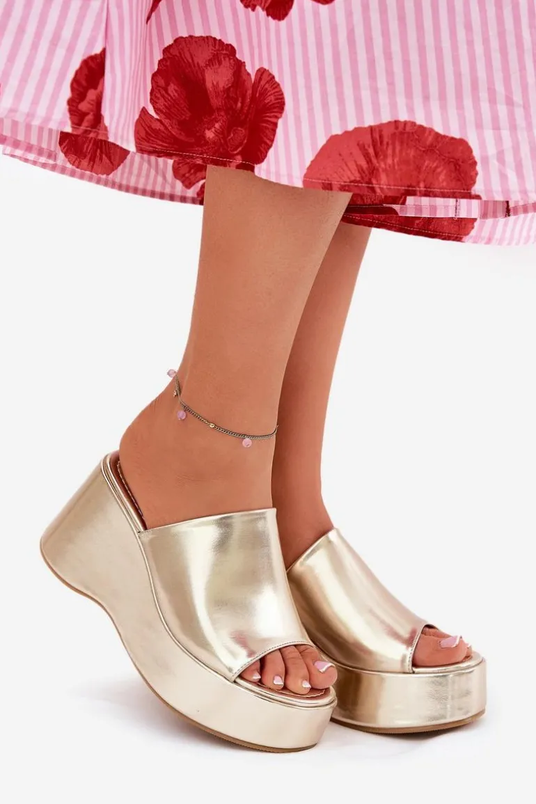 Stylowe klapki wykonane z eko skóry. Osadzone na platformie i koturnie, zapewniają stabilność i komfort przez cały dzień, jednocześnie optycznie wydłużając nogi i podkreślając sylwetkę. Miękka wkładka gwarantuje przyjemność noszenia, zapewniając odpowiednią amortyzację i wygodę podczas chodzenia. Te klapki doskonale sprawdzą się w codziennych stylizacjach, idealne do letnich sukienek, spódnic czy spodni. Przy wyborze rozmiaru prosimy sugerować się tabelą rozmiarów.
