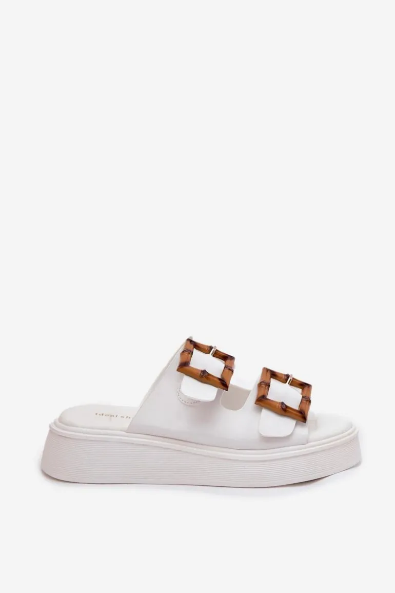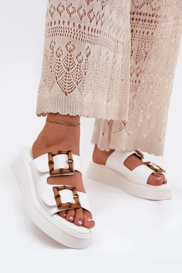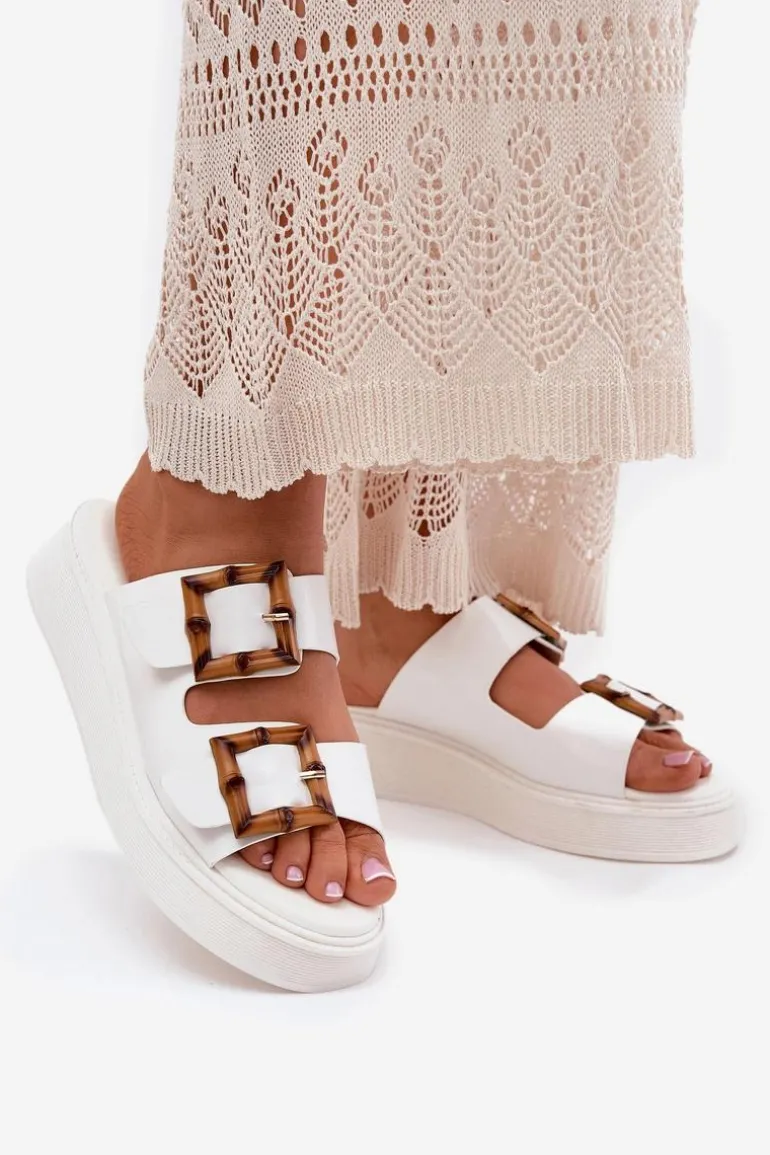 Eko Skórzane Klapki Damskie Na Platformie Z Klamrami Białe Xanivia