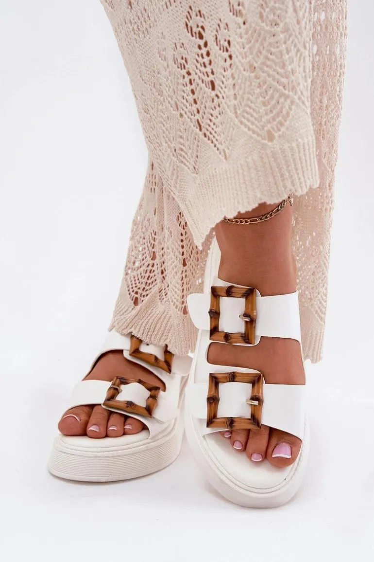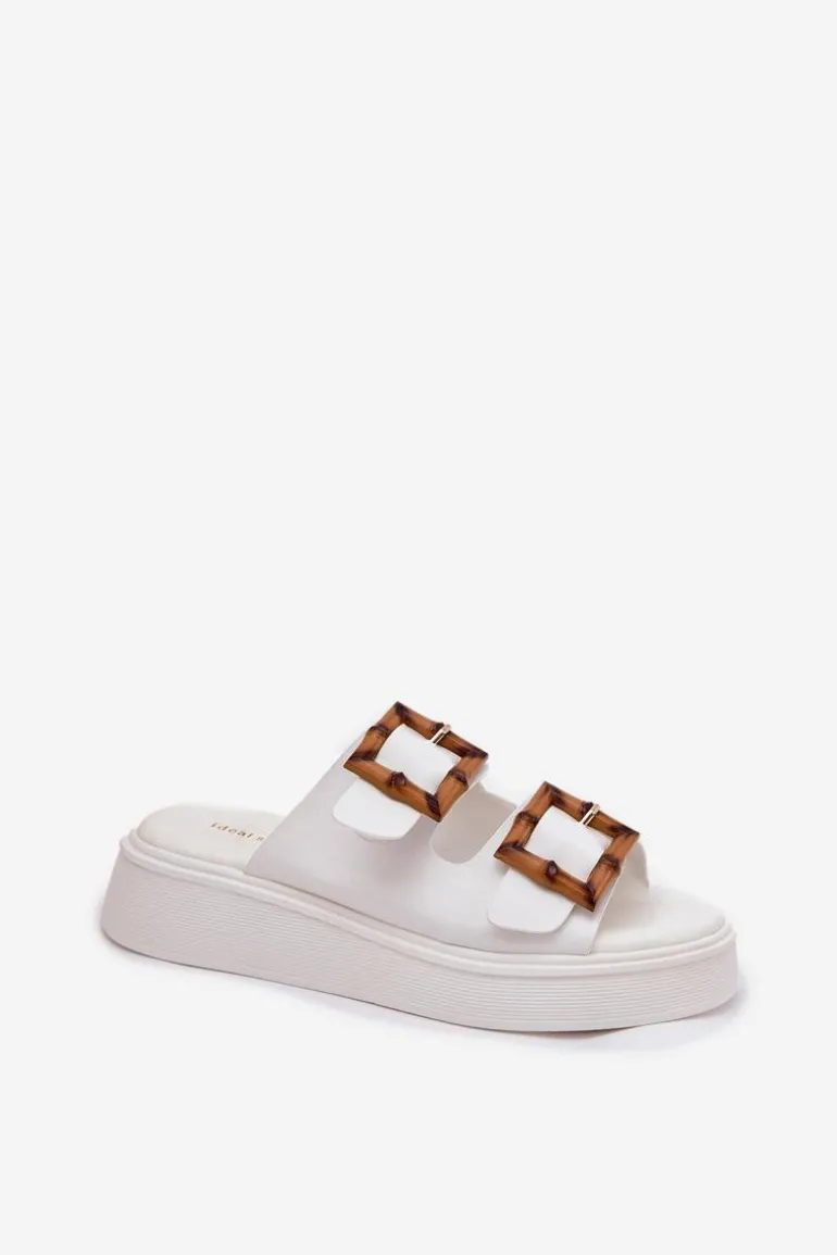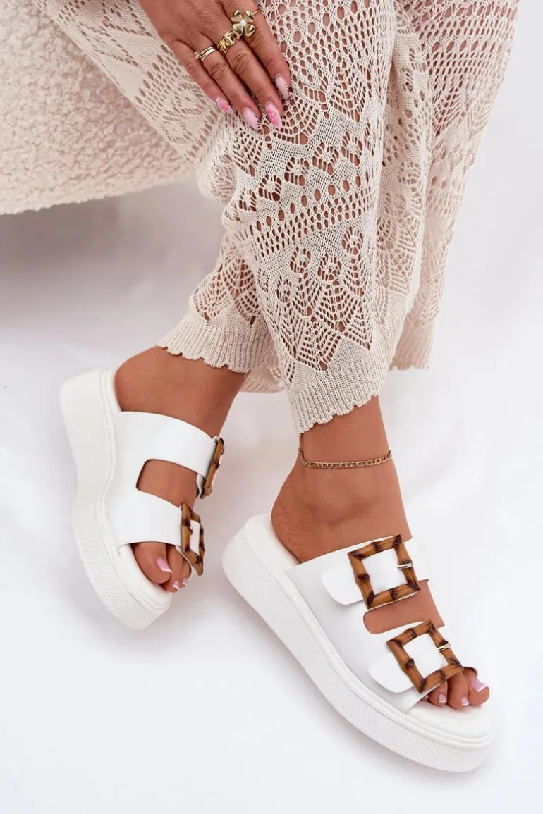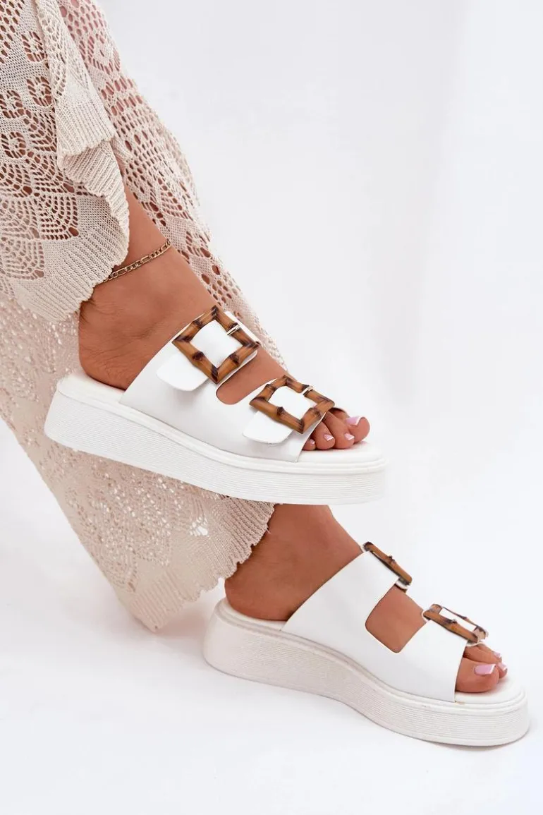 Eko Skórzane Klapki Damskie Na Platformie Z Klamrami Białe Xanivia