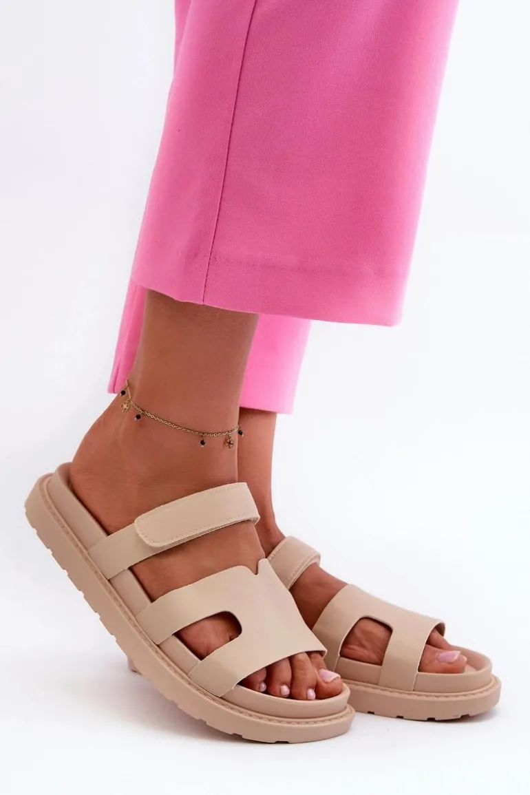 Eko Skórzane Klapki Damskie Na Rzep Jasnobeżowe Silaka