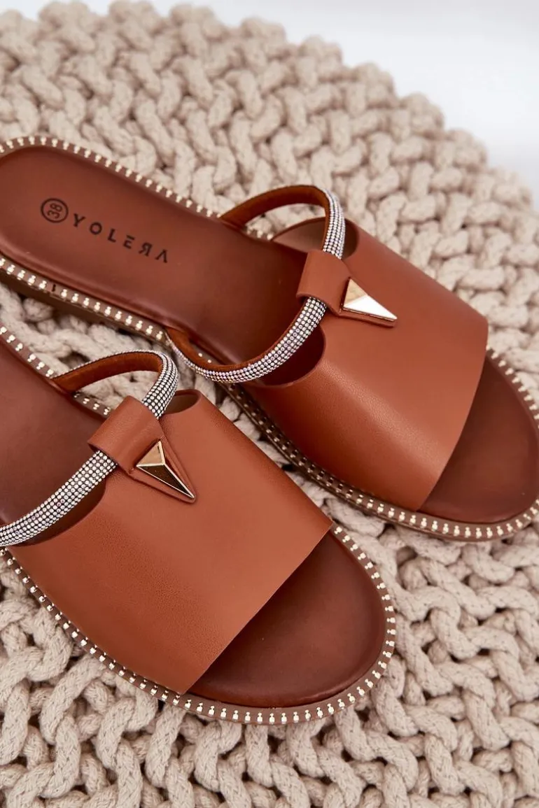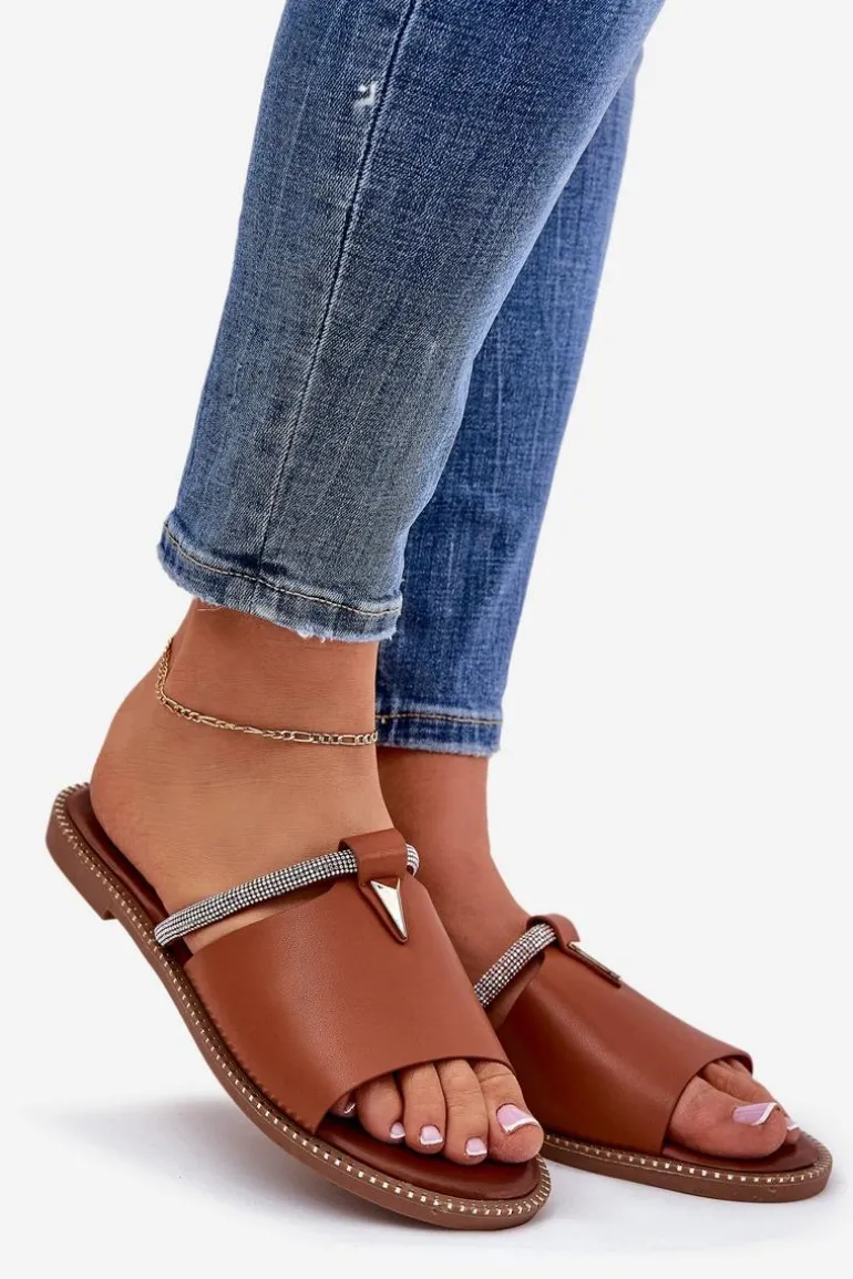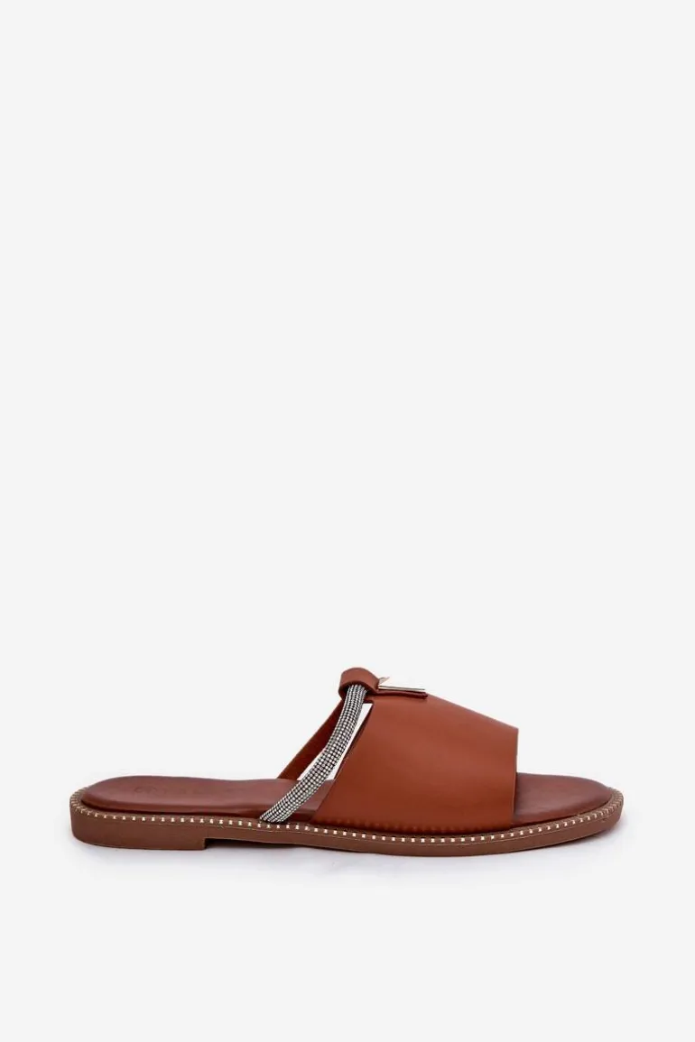 Eko Skórzane Klapki Na Płaskim Obcasie Z Ozdobnym Paseczkiem Camel Hirtewi