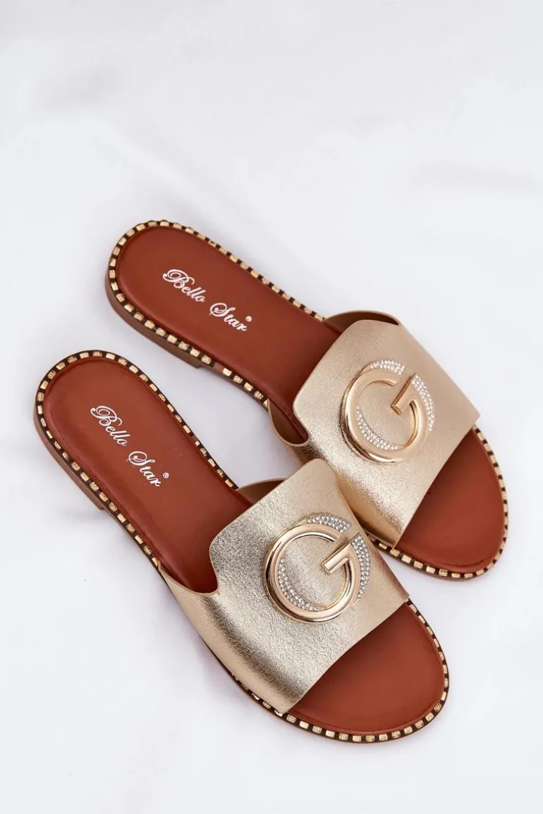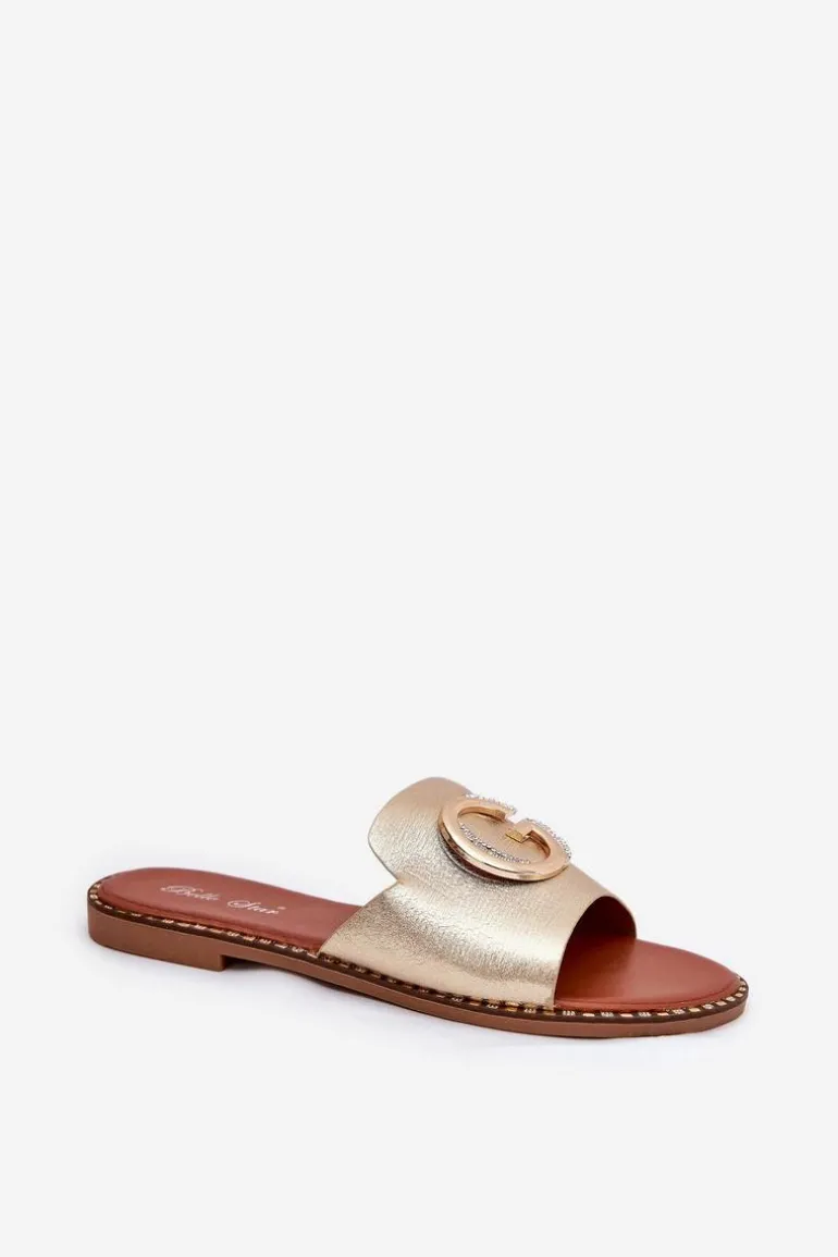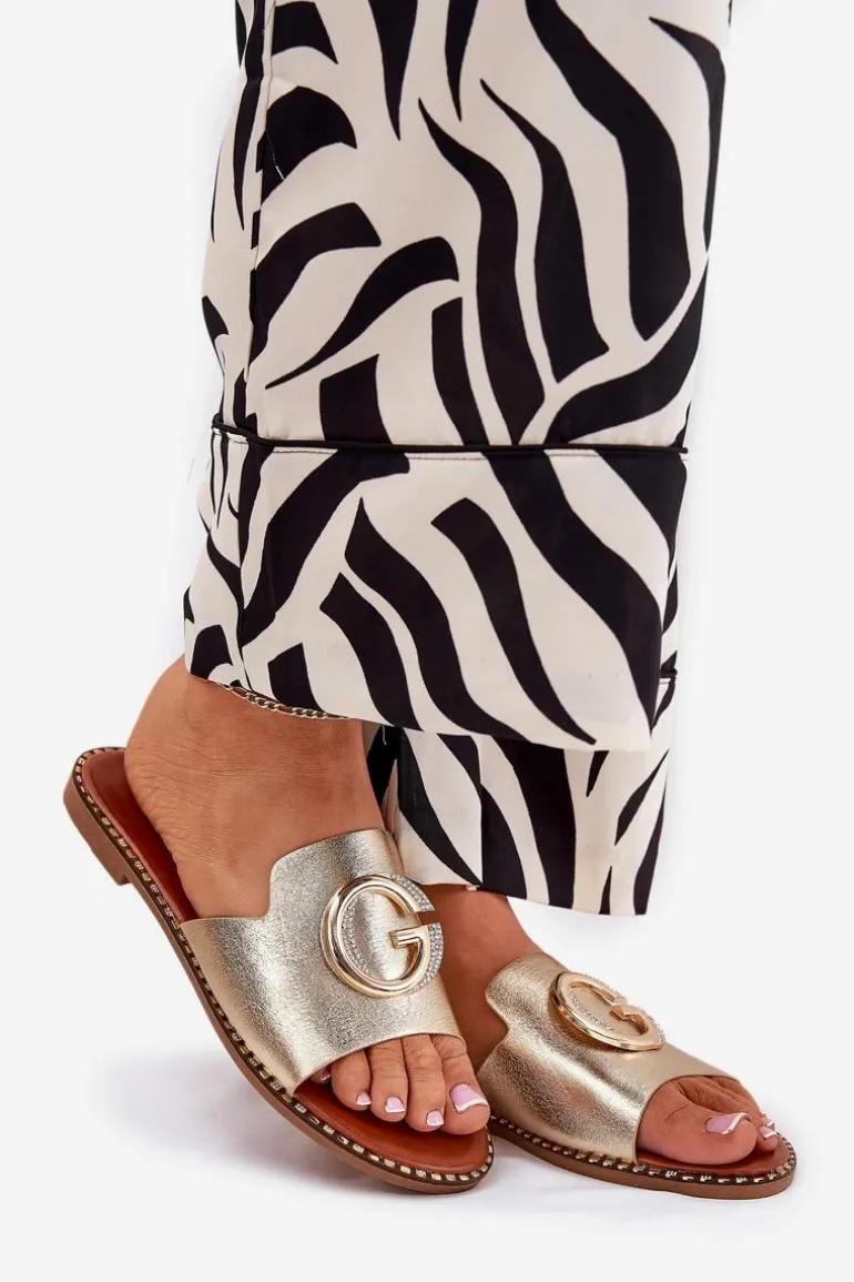 Eko Skórzane Płaskie Klapki Damskie Z Ozdobnym Detalem Złote Frelie