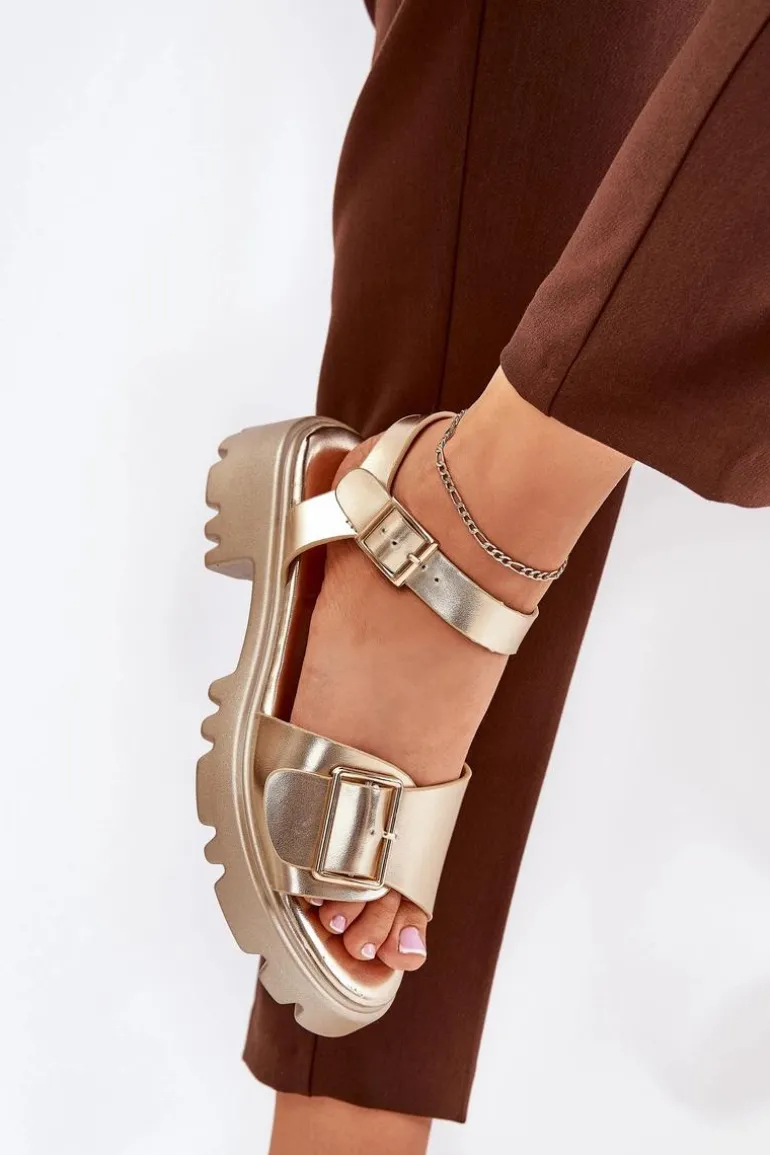 Eleganckie sandały damskie wykonane z eko skóry, osadzone na platformie oraz płaskim obcasie, które zapewniają wygodę i stabilność. Z przodu buty ozdobione zostały dużą złotą klamrą, która dodaje im subtelnej elegancji i charakteru. Zapinane na regulowany pasek ze sprzączką, co pozwala na idealne dopasowanie do stopy. Te sandały to doskonały wybór na ciepłe dni, pasujące zarówno do sukienek, jak i spodni, łącząc styl i komfort w każdej stylizacji. Przy wyborze rozmiaru prosimy sugerować się tabelą rozmiarów.