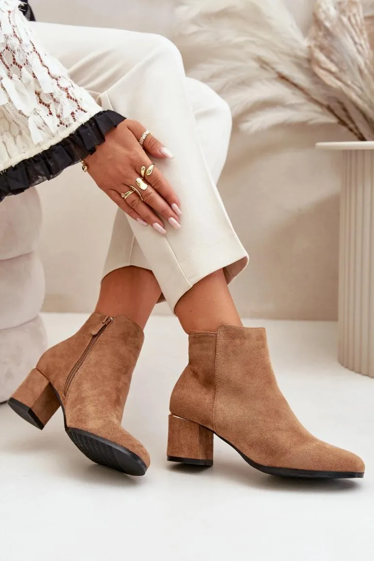 Klasyczne botki wykonane z eko zamszu, które wyróżniają się eleganckim i ponadczasowym stylem. Zapinane na zamek, co ułatwia ich zakładanie i zdejmowanie, oferują wygodę i praktyczność. Zaokrąglone noski dodają im subtelności, czyniąc je idealnym dodatkiem do wielu różnych stylizacji. Przy wyborze rozmiaru prosimy sugerować się tabelą rozmiarów.