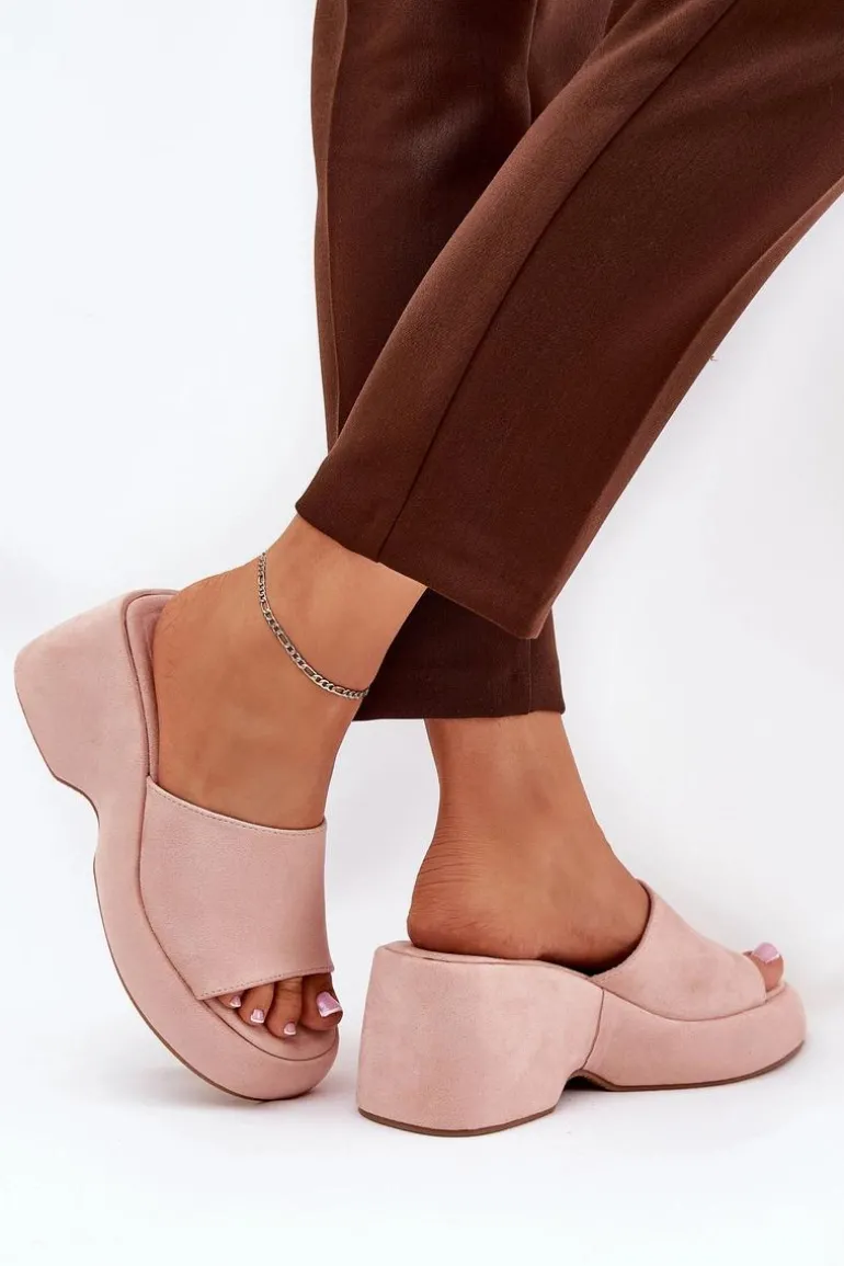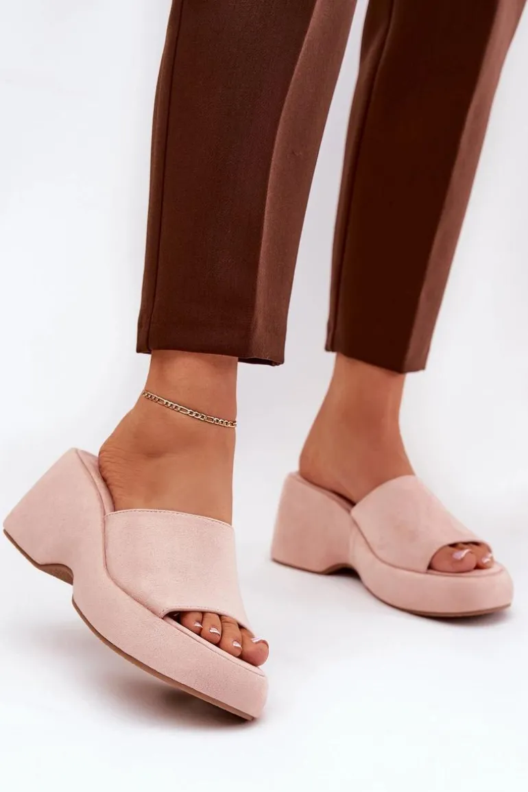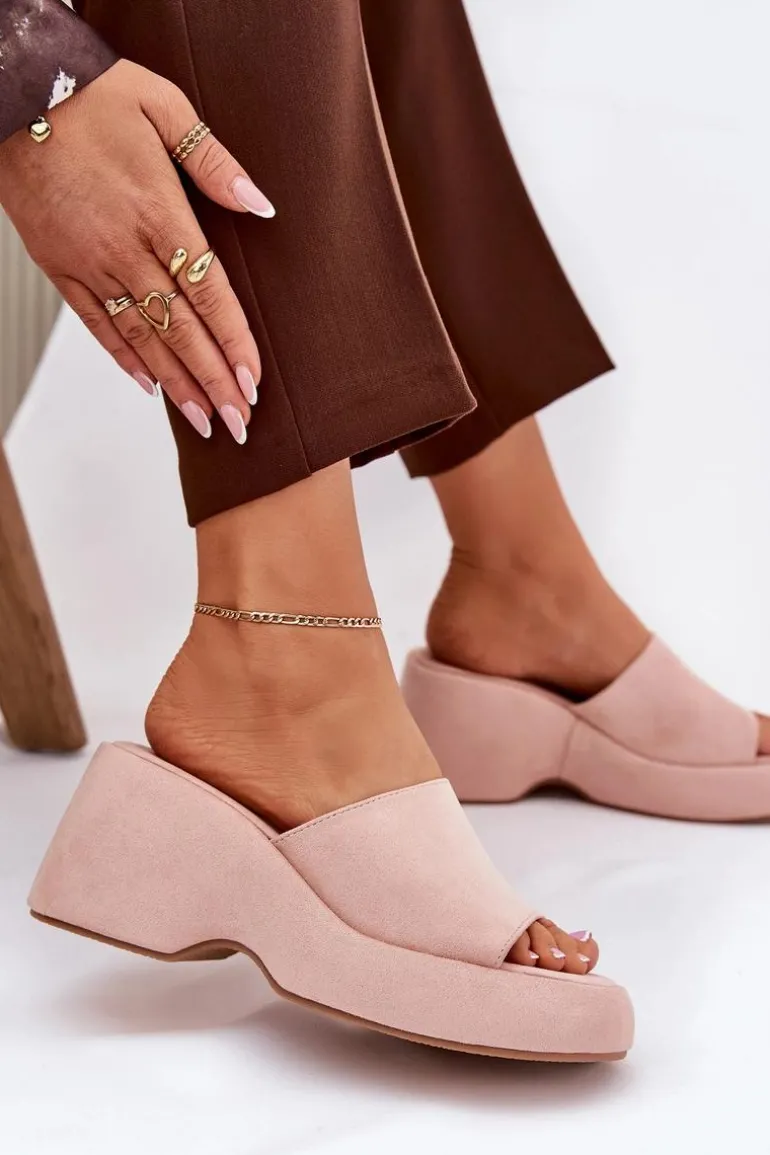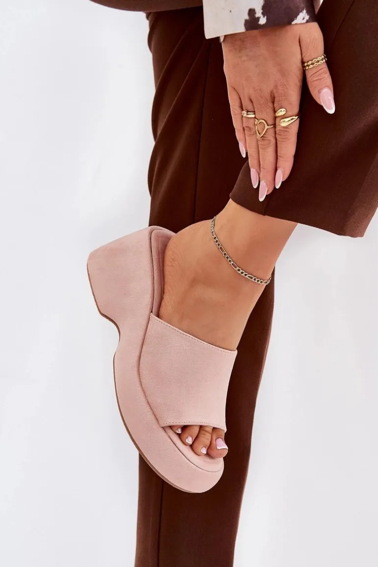 Eko Zamszowe Klapki Damskie Na Platformie I Koturnie Różowe Afisal