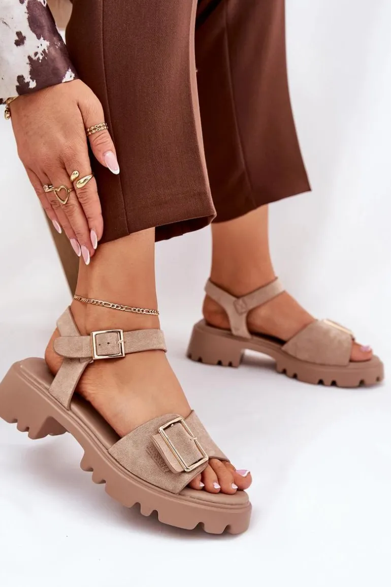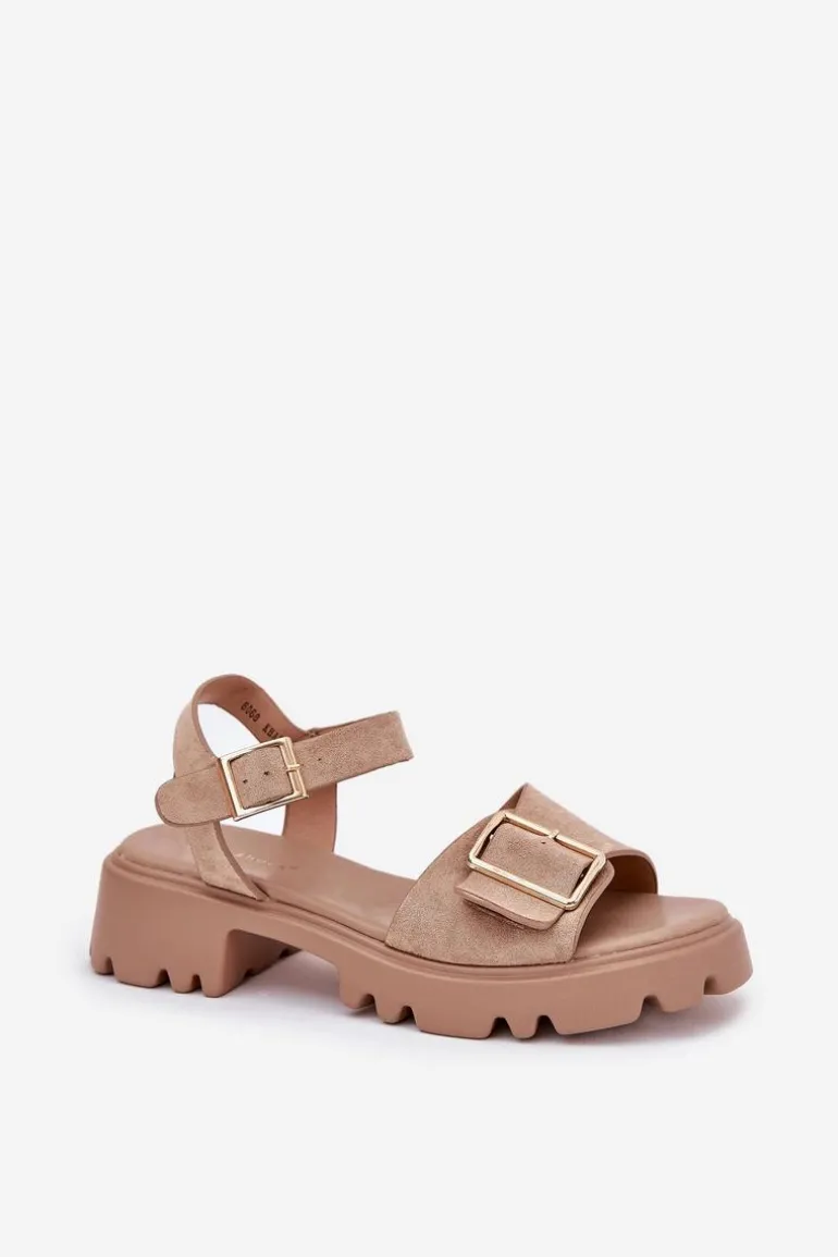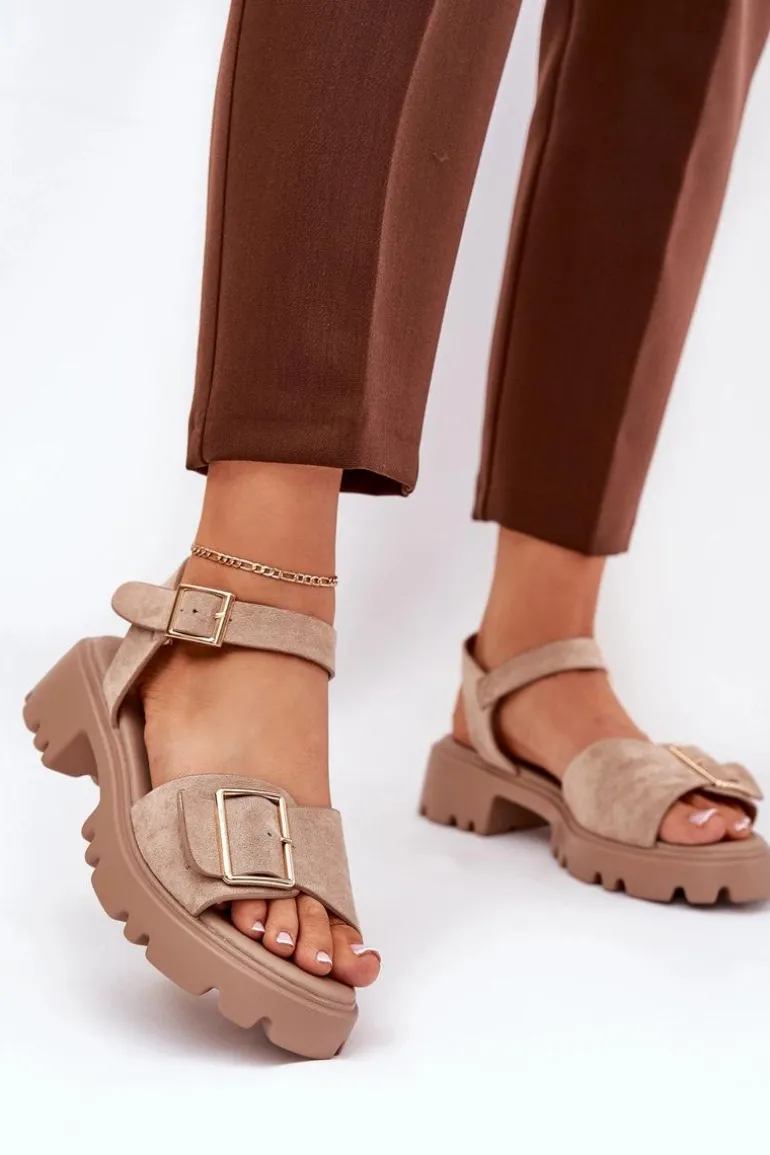 Eleganckie sandały damskie wykonane z eko zamszu, osadzone na platformie oraz płaskim obcasie, które zapewniają wygodę i stabilność. Z przodu buty ozdobione zostały dużą złotą klamrą, która dodaje im subtelnej elegancji i charakteru. Zapinane na regulowany pasek ze sprzączką, co pozwala na idealne dopasowanie do stopy. Te sandały to doskonały wybór na ciepłe dni, pasujące zarówno do sukienek, jak i spodni, łącząc styl i komfort w każdej stylizacji. Przy wyborze rozmiaru prosimy sugerować się tabelą rozmiarów.