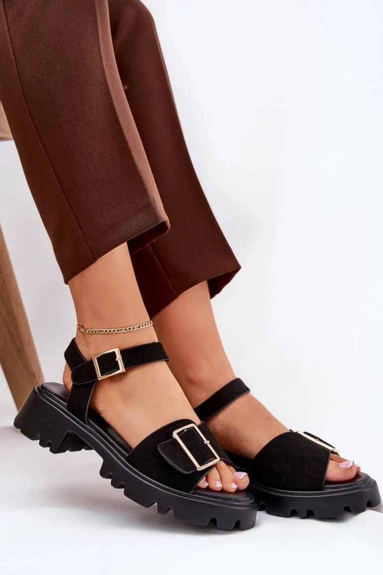 Eleganckie sandały damskie wykonane z eko zamszu, osadzone na platformie oraz płaskim obcasie, które zapewniają wygodę i stabilność. Z przodu buty ozdobione zostały dużą złotą klamrą, która dodaje im subtelnej elegancji i charakteru. Zapinane na regulowany pasek ze sprzączką, co pozwala na idealne dopasowanie do stopy. Te sandały to doskonały wybór na ciepłe dni, pasujące zarówno do sukienek, jak i spodni, łącząc styl i komfort w każdej stylizacji. Przy wyborze rozmiaru prosimy sugerować się tabelą rozmiarów.