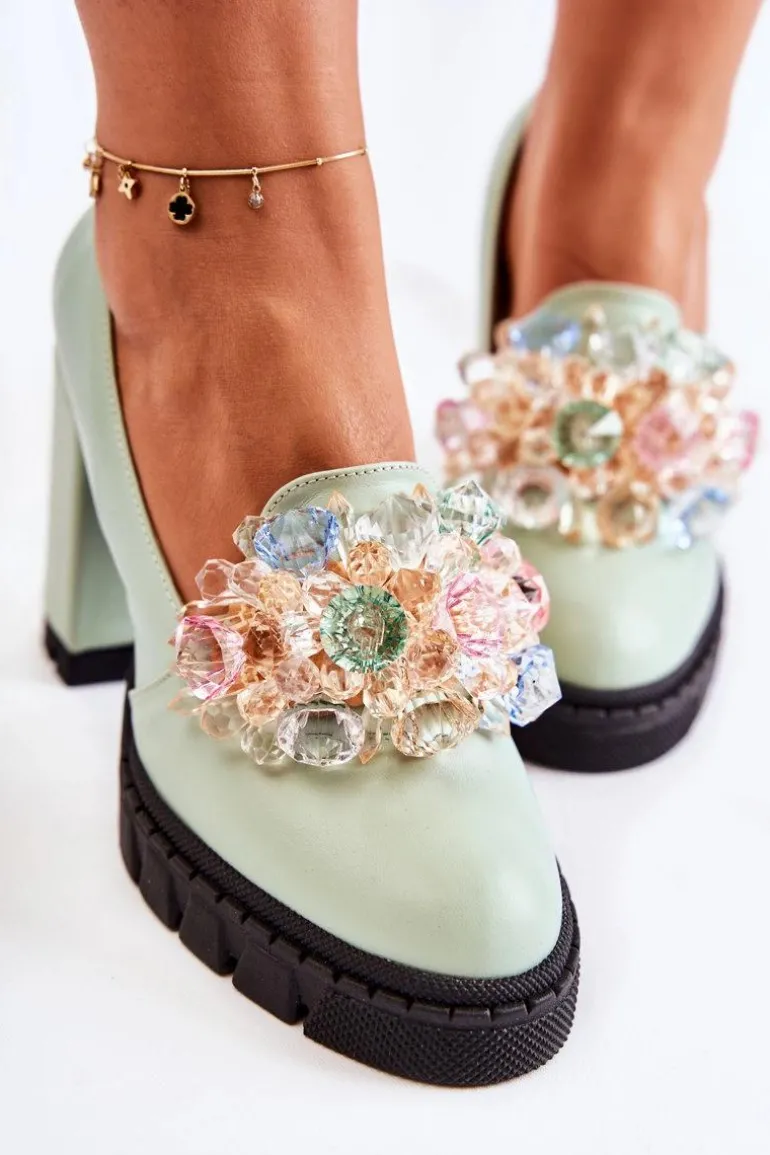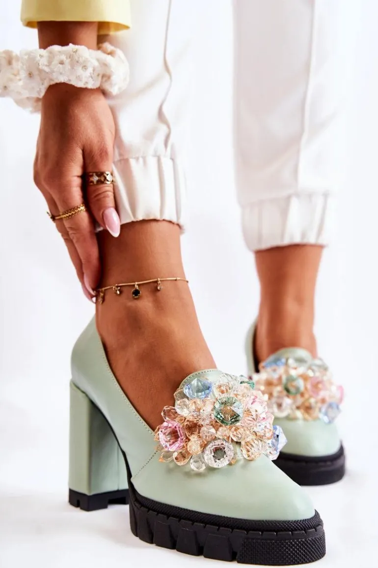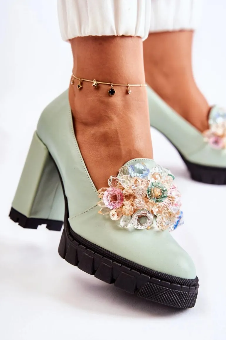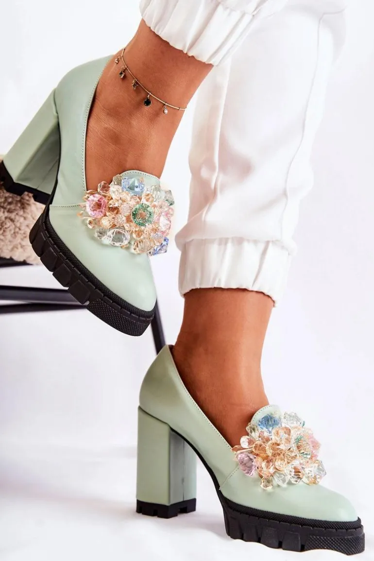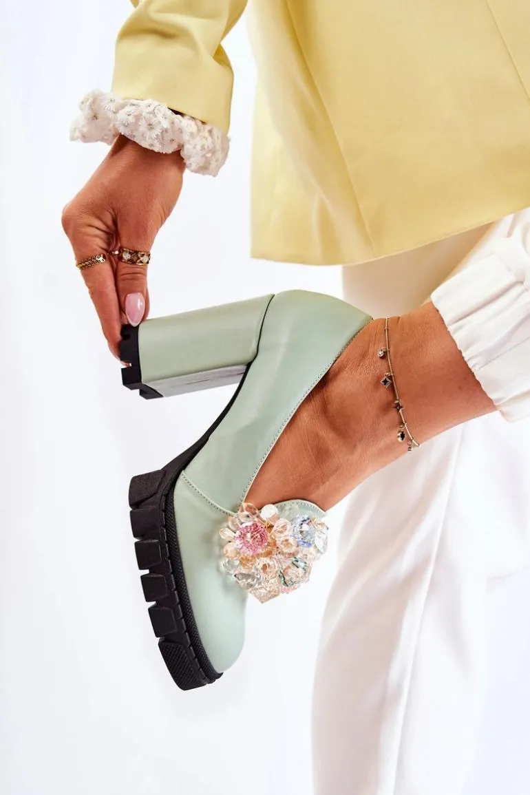 Cudne czółenka na masywnym obcasie w postaci słupka oraz platformie. Traperowa podeszwa sprawia, że te buty są wygodne i stabilne podczas użytkowania. Posiadają ozdobę w postaci imitacji kryształków z przodu obuwia. Miękka wkładka została wykonana z naturalnej skóry. Komfort to podstawa! Modny fason zachwyci niejedną miłośniczkę wysokich obcasów! Koniecznie powinnaś mieć ten model w swojej kolekcji obuwia! Przy wyborze rozmiaru prosimy sugerować się tabelą rozmiarów.
