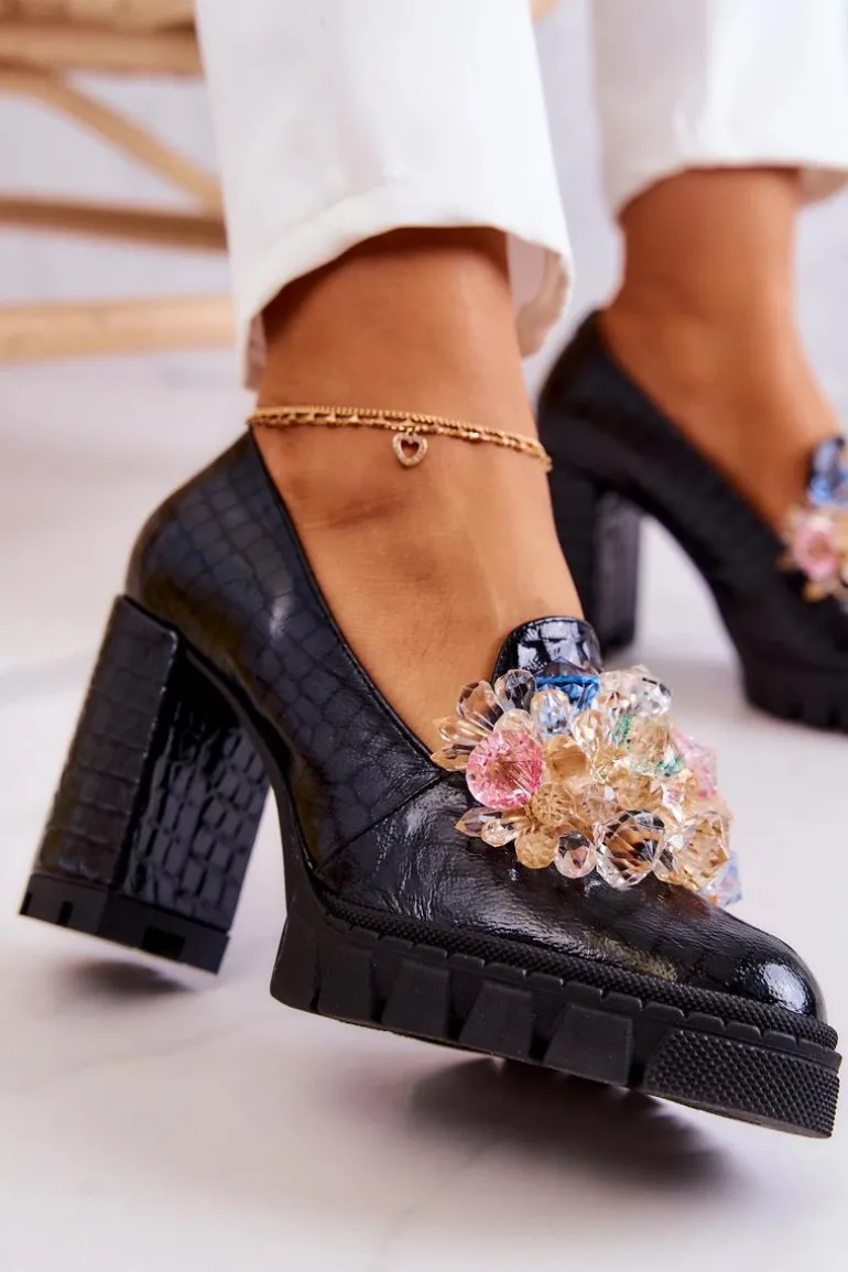 Cudne czółenka na masywnym obcasie w postaci słupka oraz platformie. Traperowa podeszwa sprawia, że te buty są wygodne i stabilne podczas użytkowania. Posiadają ozdobę w postaci imitacji barwnych kryształków z przodu obuwia. Miękka wkładka została wykonana z naturalnej skóry. Komfort to podstawa! Modny fason zachwyci niejedną miłośniczkę wysokich obcasów! Koniecznie powinnaś mieć ten model w swojej kolekcji obuwia! Przy wyborze rozmiaru prosimy sugerować się tabelą rozmiarów.