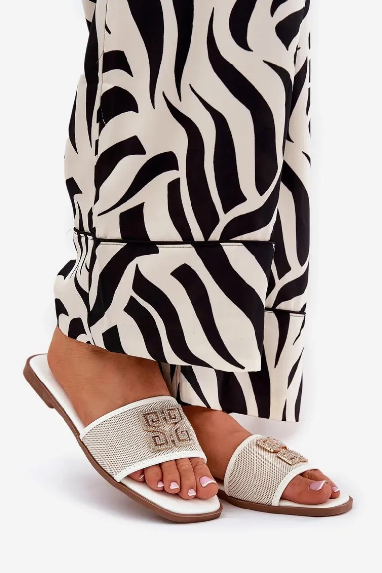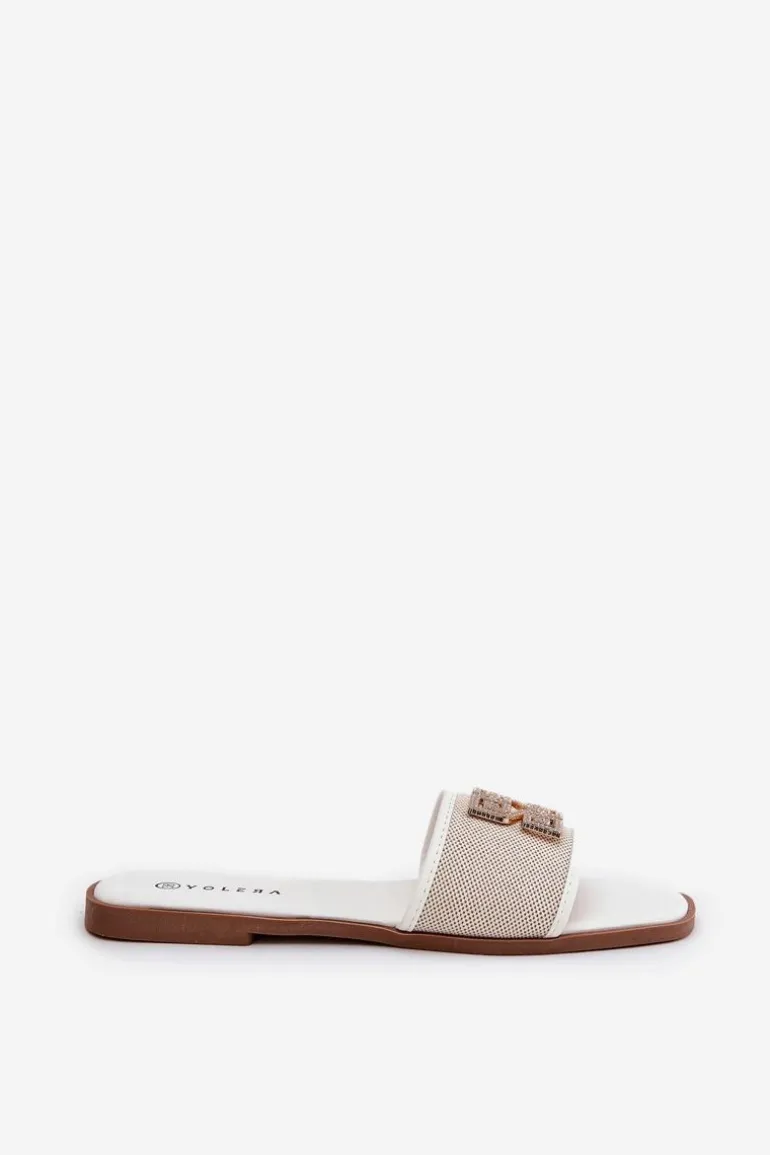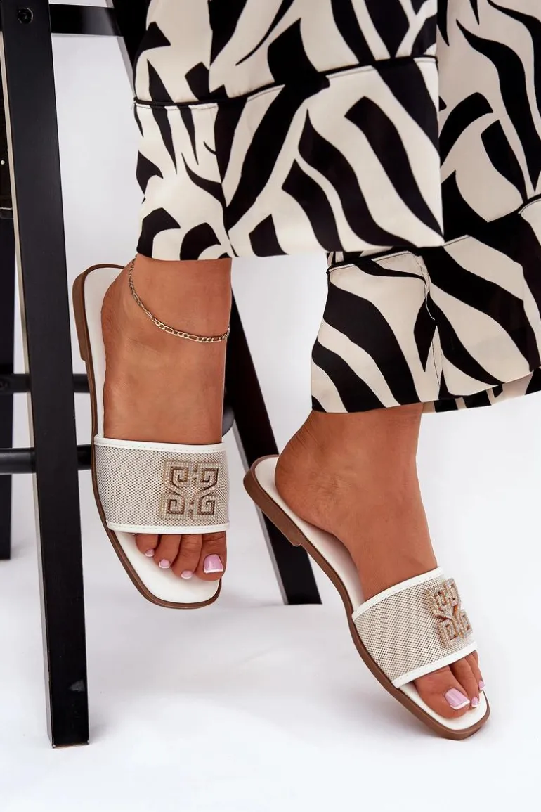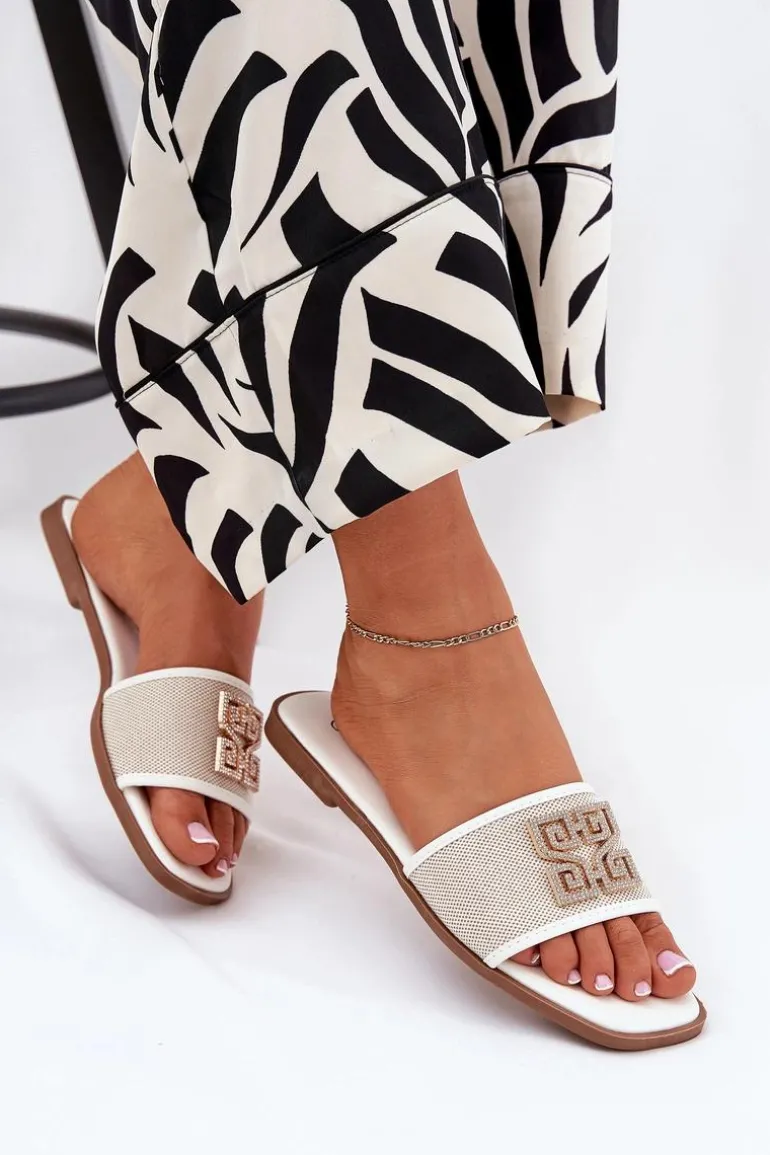 Eleganckie Klapki Damskie Z Ozdobą Na Płaskim Obcasie Białe Lovehia