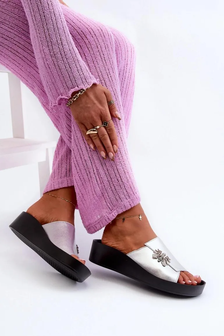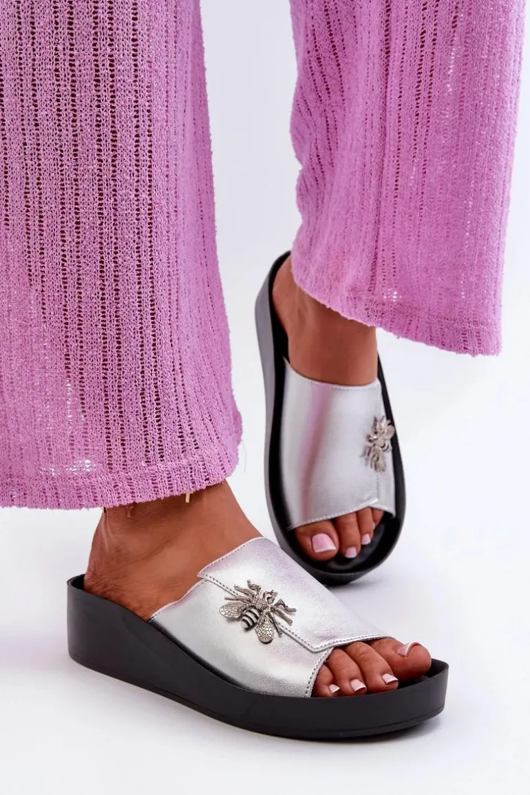 Eleganckie Klapki Damskie Z Ozdobą Skóra Naturalna S.Barski KV27-015 Srebrne