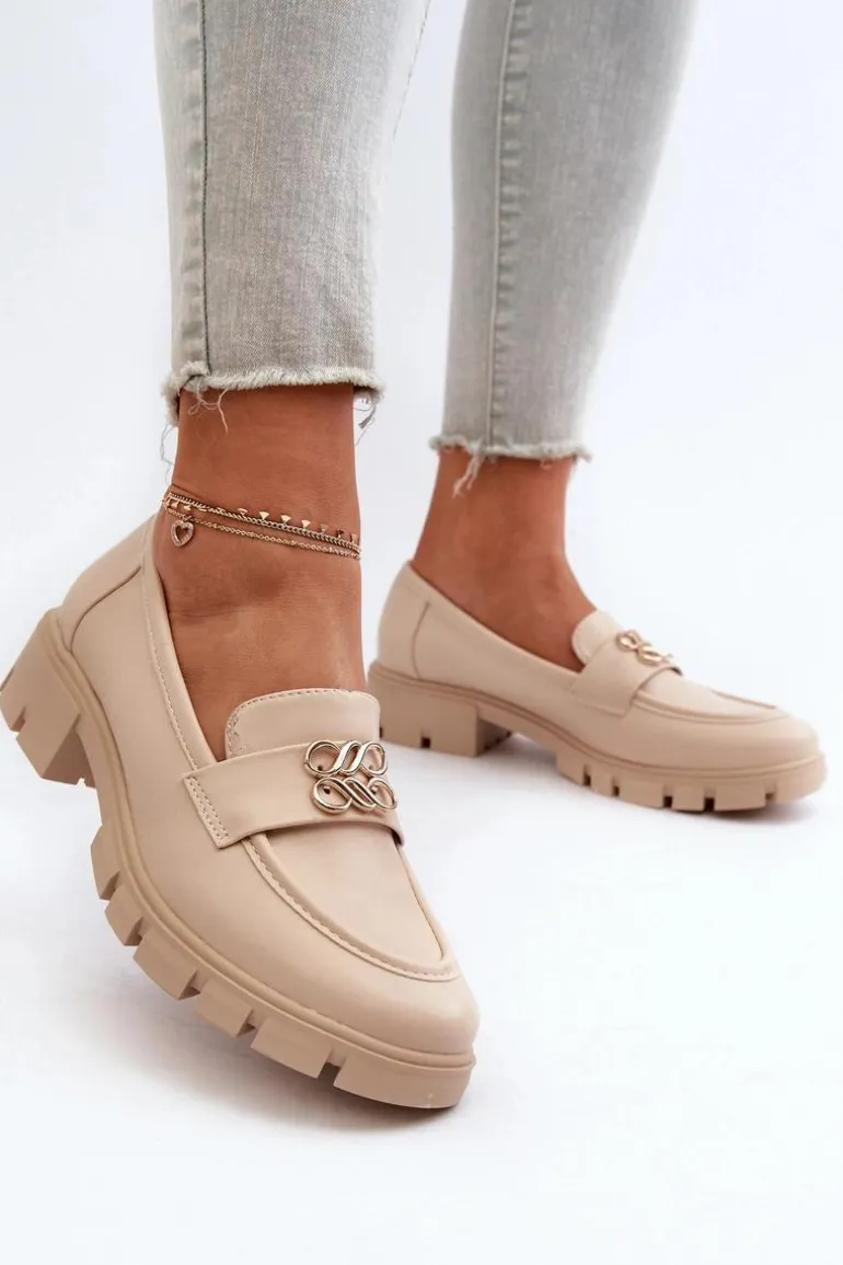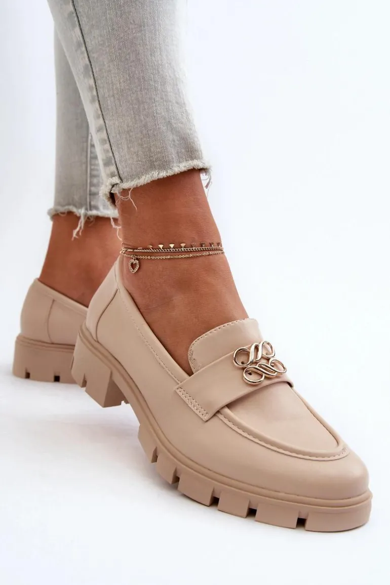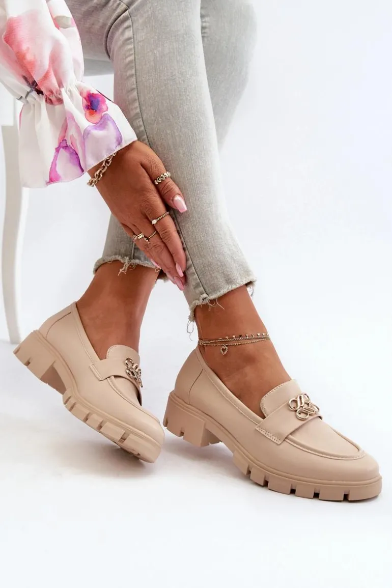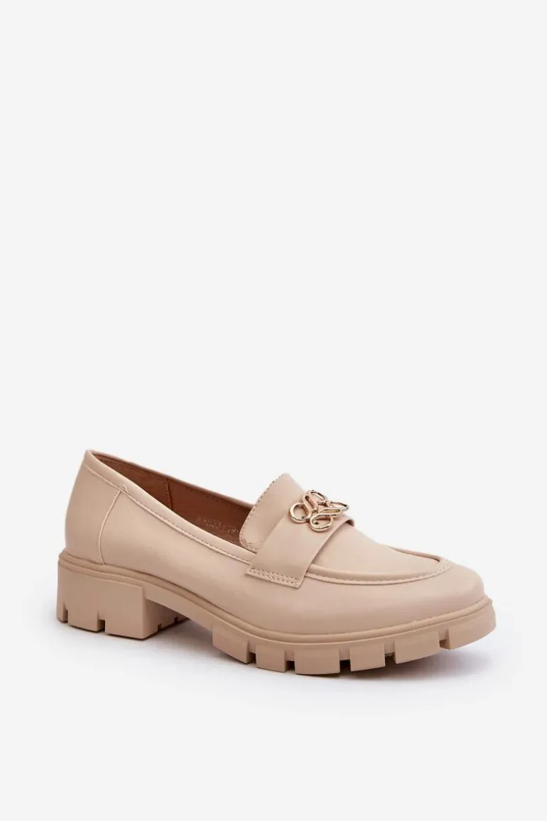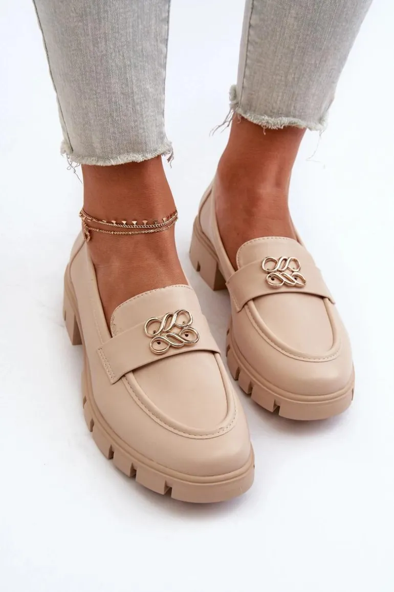 Eleganckie Mokasyny Damskie Ze Złotą Ozdobą Beżowe Tosisa