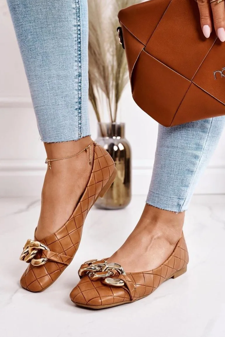 Eleganckie Pikowane Baleriny Z Łańcuchem Camel Coco