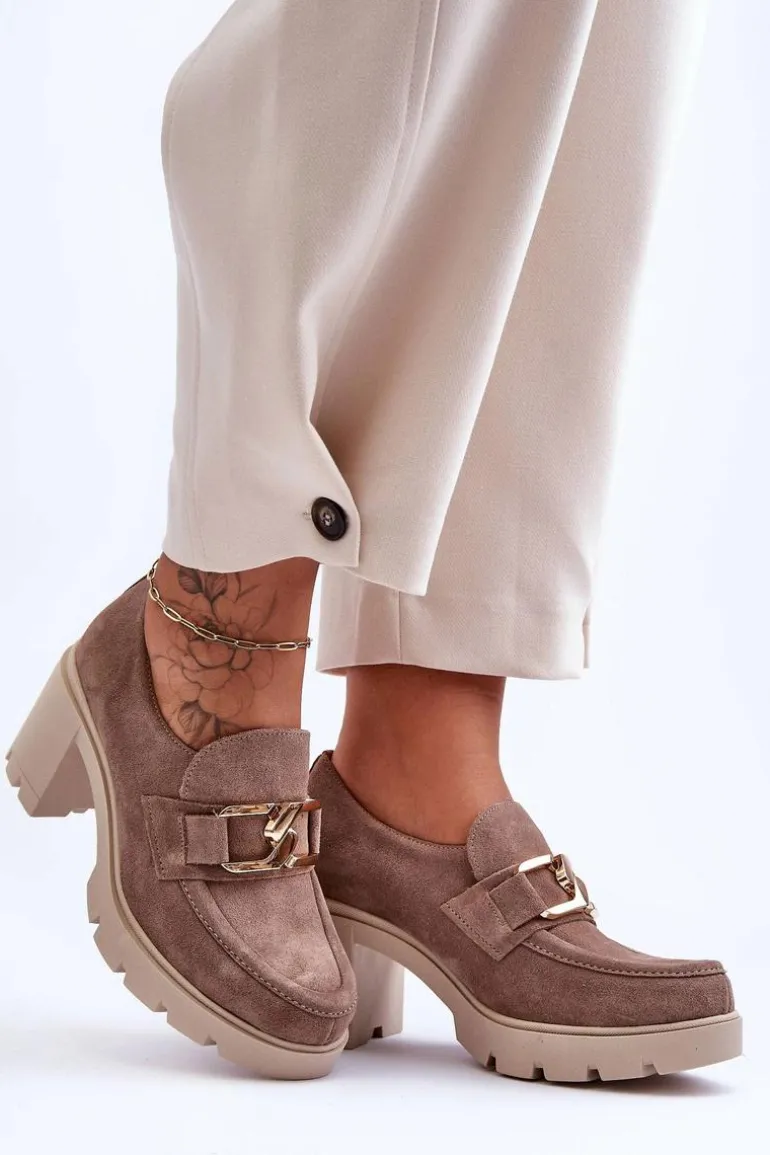Cudowne półbuty na obcasie z cholewką wykonaną ze skóry naturalnej zamszowej. Wnętrze zostało pokryte skórą naturalną oraz materiałem tekstylnym, dzięki temu są bardzo komfortowe w użytkowaniu. Wkładka ze skóry naturalnej, a podeszwa wykonana z gumowego tworzywa. Stylowy obcas w postaci szerokiego słupka zapewni stabilizację na każdym kroku. Lustrzana ozdoba na przodzie. Zapiętek jest usztywniany. Dodatkowo pod językiem znajduje się gumka ściągająca, która sprawi, że but będzie idealnie dopasowany do stopy. Przy wyborze rozmiaru prosimy sugerować się tabelą rozmiarów.