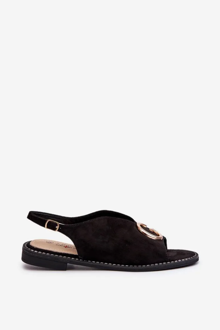Eleganckie sandały damskie marki S.Barski. Wykonane z eko zamszu. Osadzone na płaskim obcasie. Z przodu złota ozdoba. Zapinanie na regulowany pasek ze sprzączką gwarantuje idealne dopasowanie do stopy. Miękka wkładka ze skóry naturalnej zapewni komfort na każdym kroku. Model ten z pewnością dopełni wiele stylizacji! Przy wyborze rozmiaru prosimy kierować się tabelą rozmiarów.