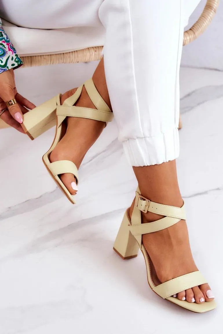 Klasyczne i eleganckie sandały na obcasie w postaci słupka. Buty wykonane są w całości ze skóry ekologicznej. Posiadają regulowany pasek zapinany na sprzączkę. Pięknie prezentują się na nodze. Miękka wkładka sprawi, że będziesz czuć się komfortowo. Koniecznie powinnaś mieć w swojej garderobie sandałki na obcasie, dlatego nie zwlekaj i kup już teraz! Przy wyborze rozmiaru prosimy sugerować się tabelą rozmiarów