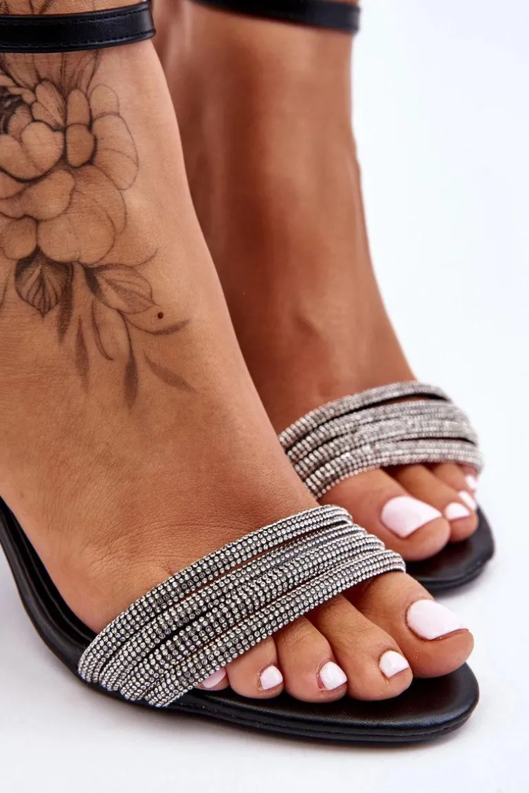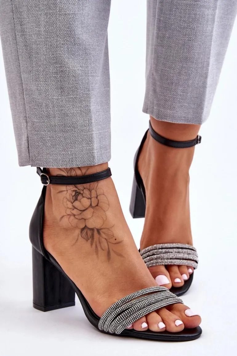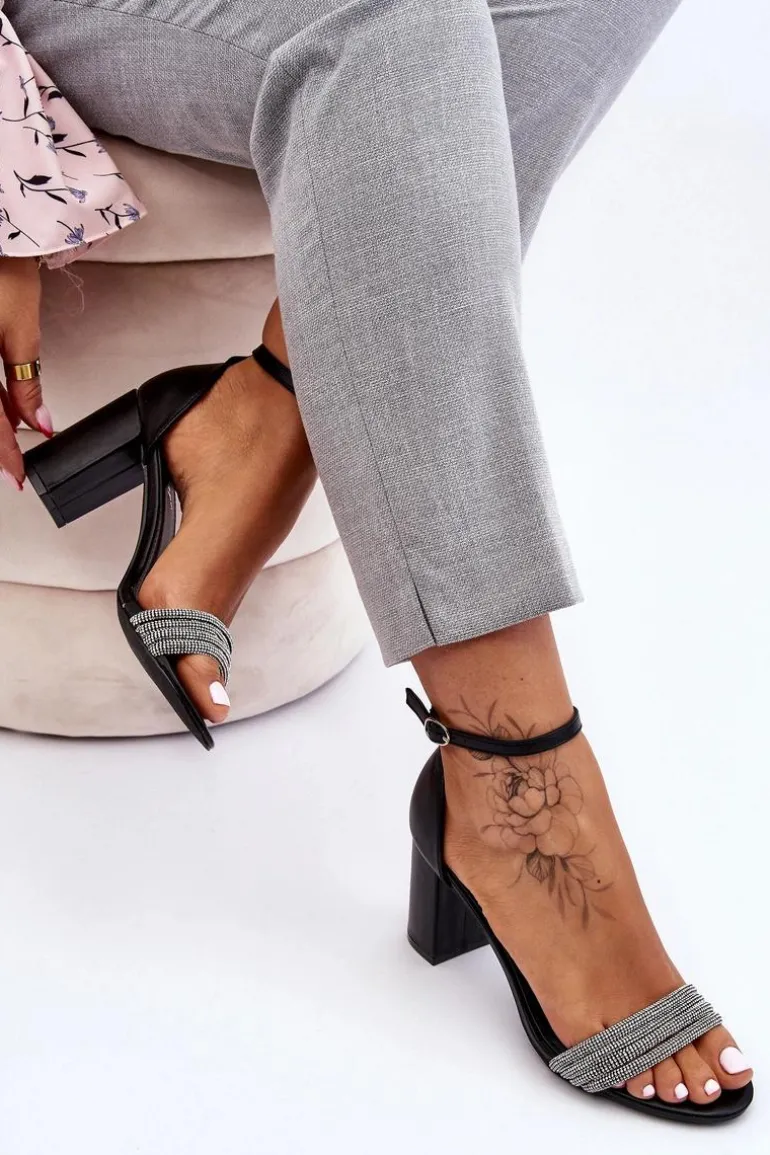 Cudowne sandały na obcasie w postaci stabilnego słupka. Zostały wykonane z eko skóry. Eleganckie zdobienia na przodzie w postaci dżetów imitujących cyrkonie. Nosek odkryty, zaokrąglony. Miękka wkładka oraz średniej wysokości obcas zapewnią komfort podczas użytkowania. Buty posiadają regulowany pasek zapinany na sprzączkę wokół kostki. Model ten z pewnością wykorzystasz w wielu sytuacjach. Koniecznie sprawdź całą naszą kolekcję damskich sandałów na obcasie! Przy wyborze rozmiaru prosimy sugerować się tabelą rozmiarów.