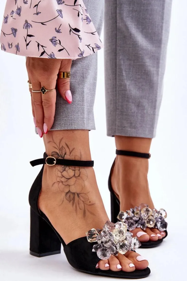 Niezwykłe sandały na obcasie w postaci słupka. Paseczek na przodzie został ozdobiony modnymi kryształkami, co dodaje tym butom elegancji. Miękka wkładka z eko skóry zadba o Twój komfort podczas użytkowania. Model ten świetnie sprawdzi się na różnego rodzaju ważnych uroczystościach czy spotkaniach biznesowych. Koniecznie powinnaś je mieć w swojej garderobie! Przy wyborze rozmiaru prosimy sugerować się tabelą rozmiarów.