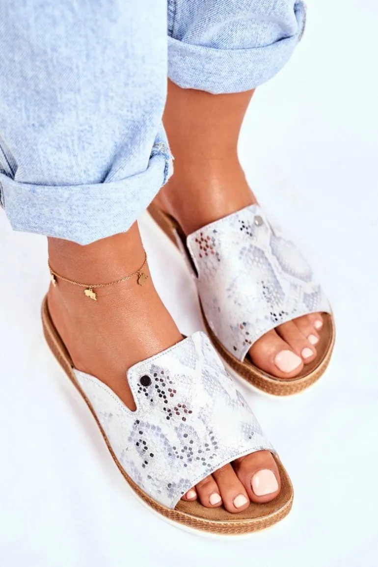 Eleganckie Skórzane Klapki Wzór Zwierzęcy Białe Nicole 2495