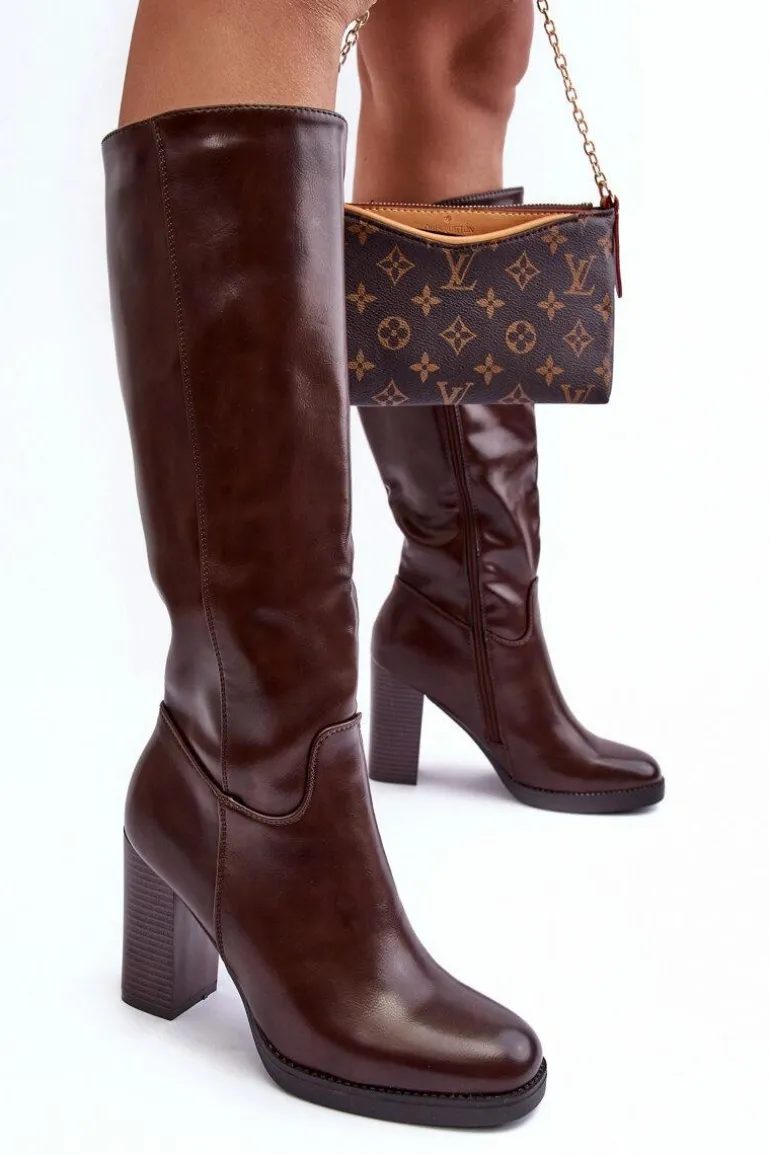 Eleganckie kozaki damskie z cholewką przed kolano. Wykonane z eko skóry. Osadzone na obcasie w postaci słupka. Zapinane na suwak po wewnętrznej stronie cholewki. Środek ocieplony kocem obuwniczym. Zapiętek w tym obuwiu jest usztywniony. Wykorzystasz je w wielu stylizacjach! Przy wyborze rozmiaru prosimy sugerować się tabelą rozmiarów.