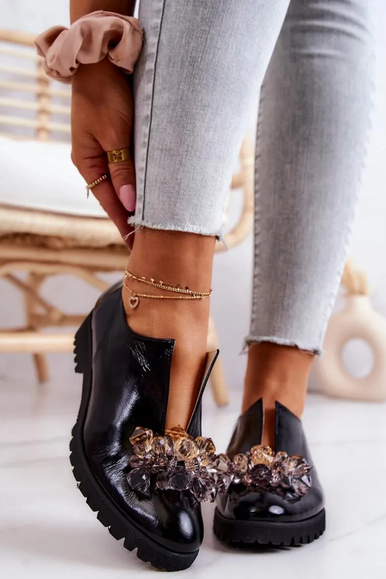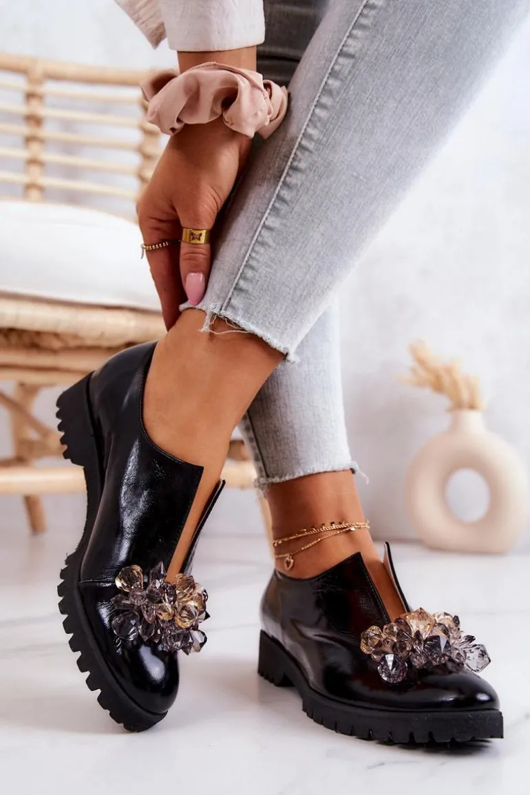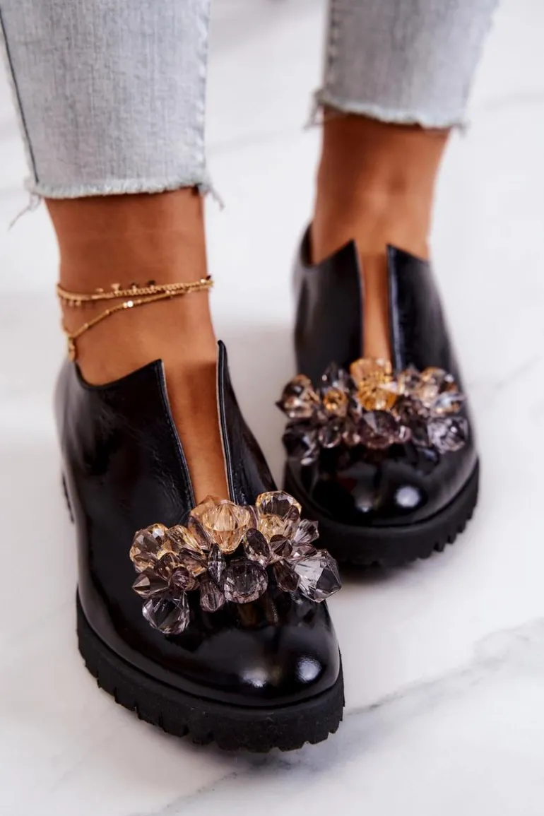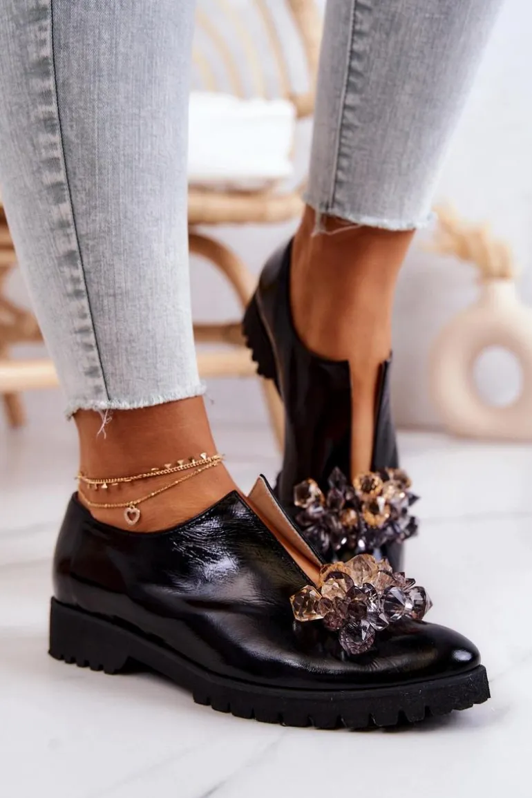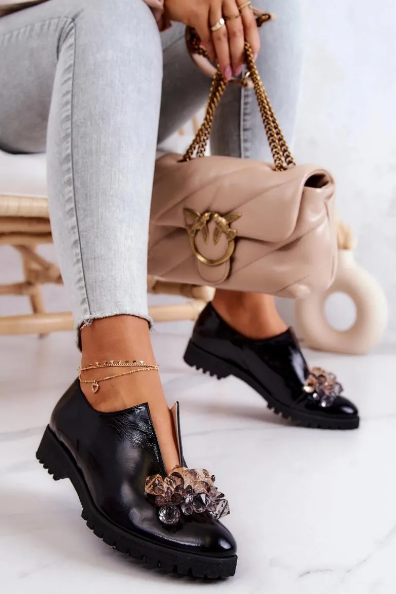 Eleganckie Skórzane Półbuty Z Ozdobą Czarne Cindy