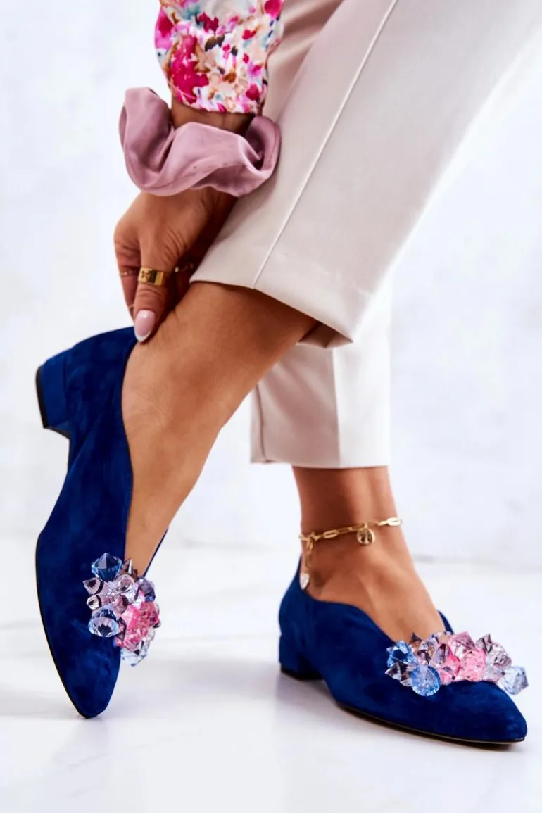 Eleganckie półbuty wykonane zostały z naturalnej zamszowej skóry. Nosek w szpic. Z przodu posiadają ozdobę w postaci kryształków. Wkładka jest wykonana ze skóry naturalnej, aby zapewnić jak największy komfort podczas użytkowania. Płaski obcas zapewni stabilizację. Buty są eleganckie i modne. Model ten świetnie sprawdzi się do eleganckich stylizacji np.: na uroczystości rodzinne czy spotkania biznesowe. Ten fason skradnie serce niejednej wielbicielki modowych nowości! Przy wyborze rozmiaru prosimy sugerować się tabelą rozmiarów.