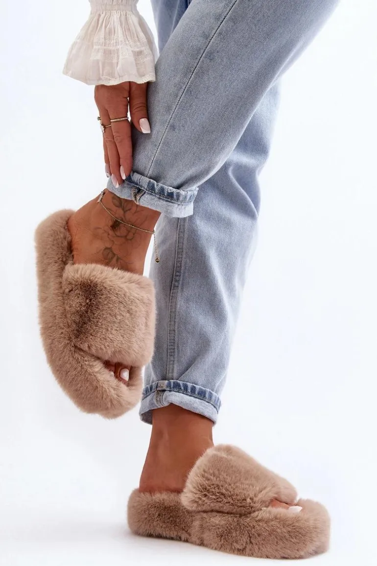 Kapcie damskie zostały wykonane z ekologicznego futerka. Model wsuwany z odkrytym noskiem i szerokim paskiem. Podeszwa wykonana z gumowego tworzywa ochroni przed zimnym podłożem. Przy wyborze rozmiaru prosimy kierować tabelą rozmiarów.