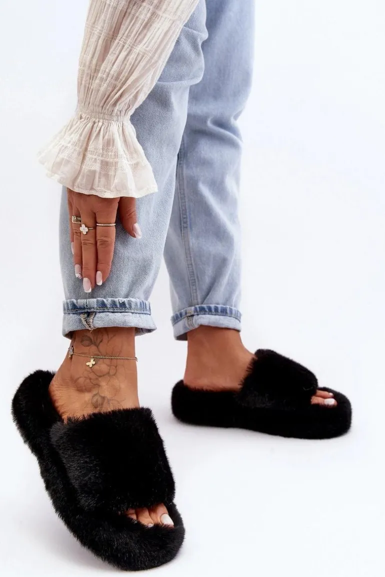 Kapcie damskie zostały wykonane z ekologicznego futerka. Model wsuwany z odkrytym noskiem i szerokim paskiem. Podeszwa wykonana z gumowego tworzywa ochroni przed zimnym podłożem. Przy wyborze rozmiaru prosimy kierować tabelą rozmiarów.