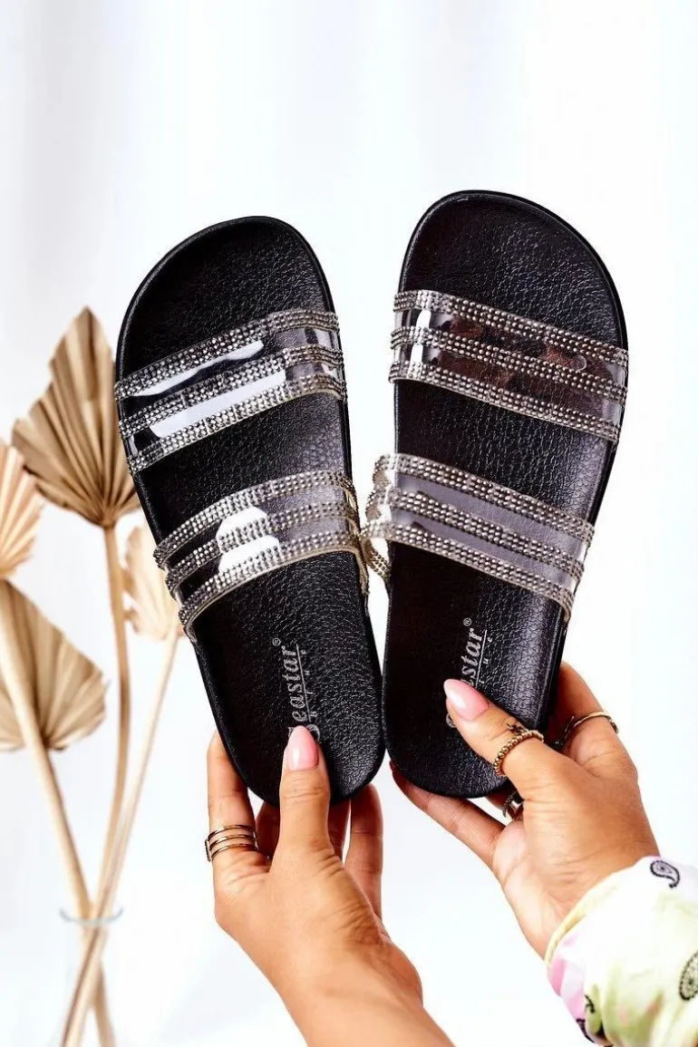 Gumowe klapki damskie ozdobione cyrkoniami. Klapki wykonane są z lekkiego gumowego tworzywa.Przy wyborze rozmiaru prosimy sugerować się tabelą rozmiarów.