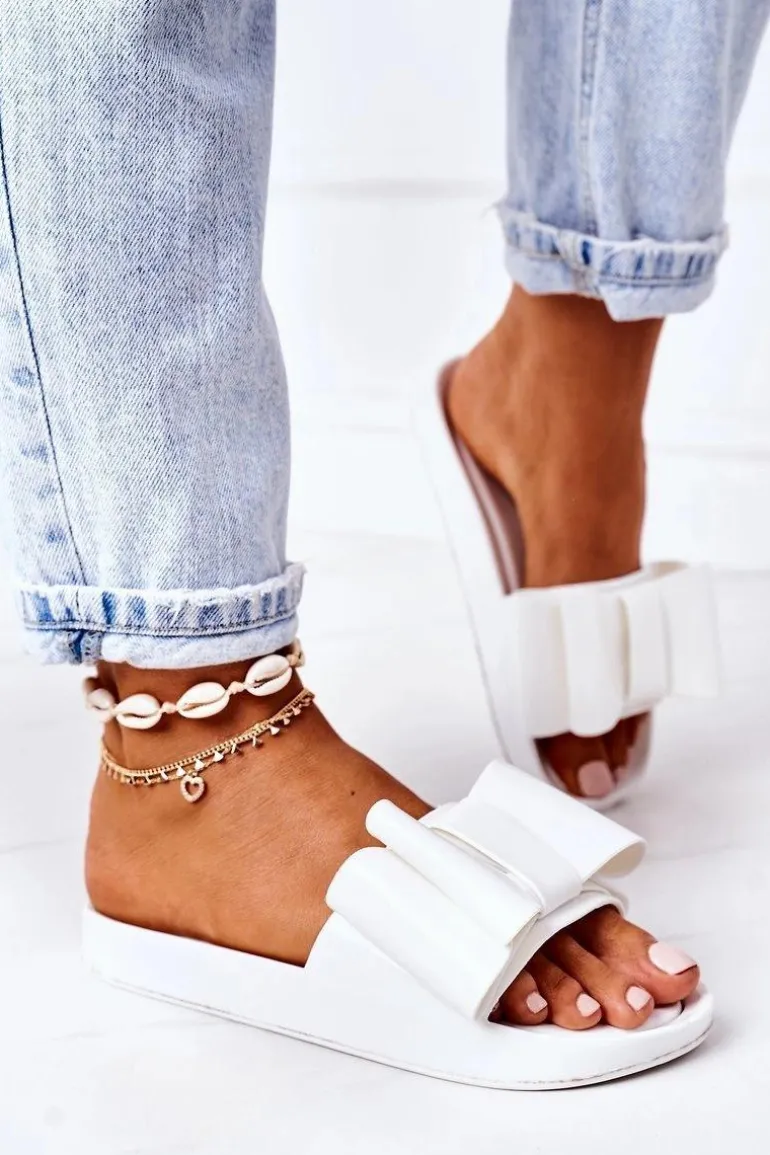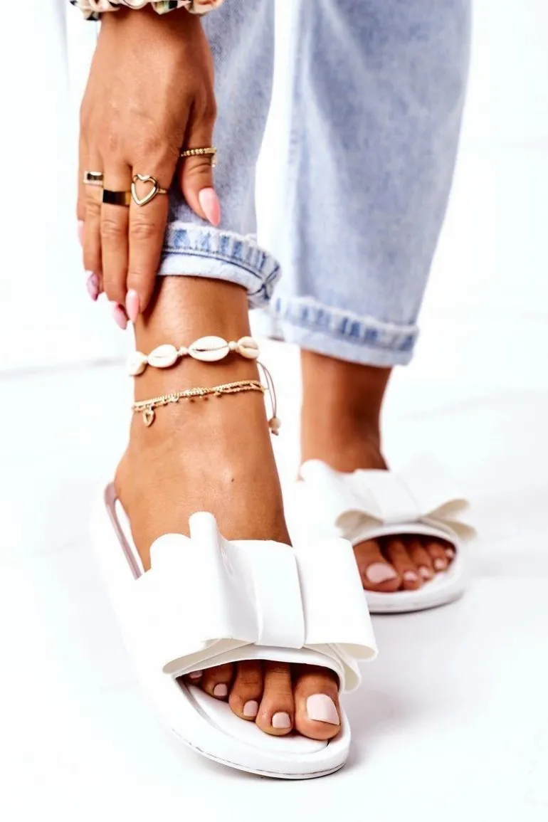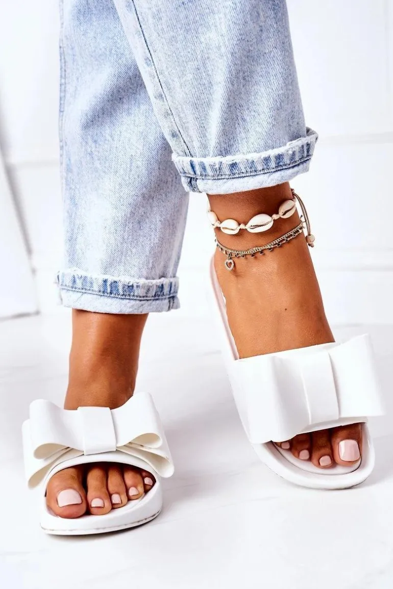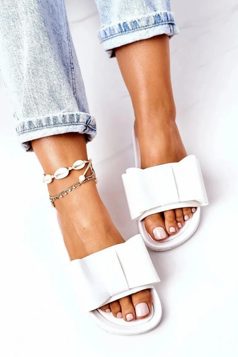 Gumowe klapki damskie z kokardą. Buty posiadają miękką wkładkę ze skóry ekologicznej. Przy wyborze rozmiaru prosimy sugerować się tabelą rozmiarów. 2 Gatunek. Na łączeniu podeszwy widoczny jest klej.