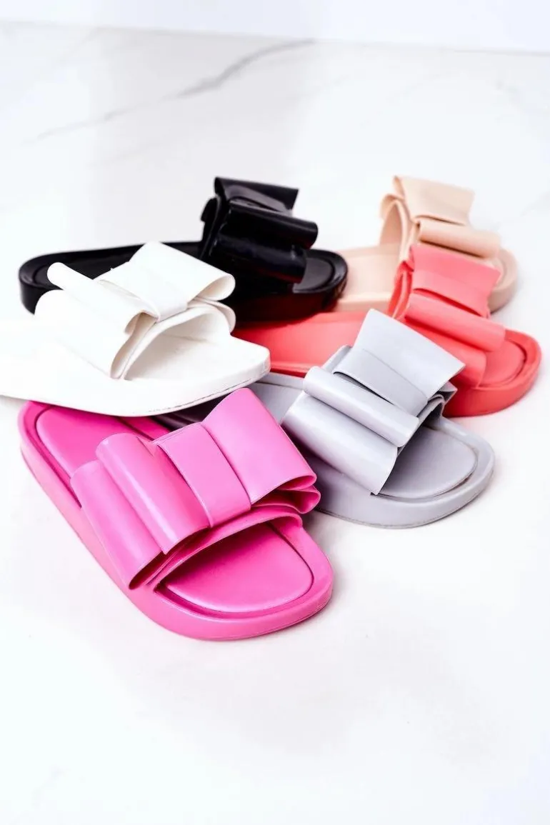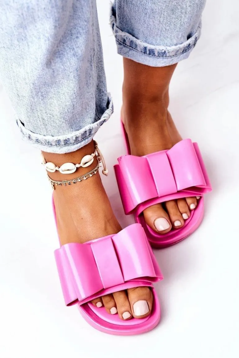 Gumowe klapki damskie z kokardą. Buty posiadają miękką wkładkę ze skóry ekologicznej. Przy wyborze rozmiaru prosimy sugerować się tabelą rozmiarów. 2 Gatunek. Na łączeniu podeszwy widoczny jest klej.