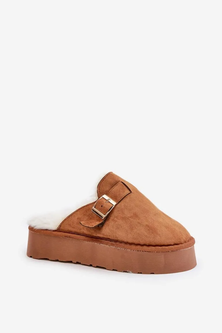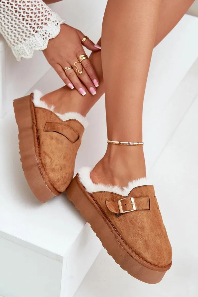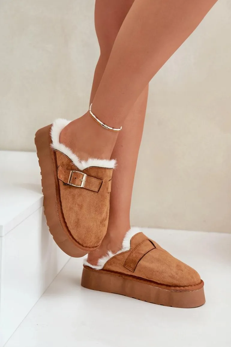 Stylowe damskie kapcie na grubej podeszwie to idealny wybór na chłodniejsze dni. Ocieplane miękkim futerkiem, zapewniają wyjątkowy komfort i ciepło. Ozdobione paskiem ze złotą klamrą. Idealne do noszenia w domu i szybkie wyjścia na zewnątrz. Przy wyborze rozmiaru prosimy kierować tabelą rozmiarów.