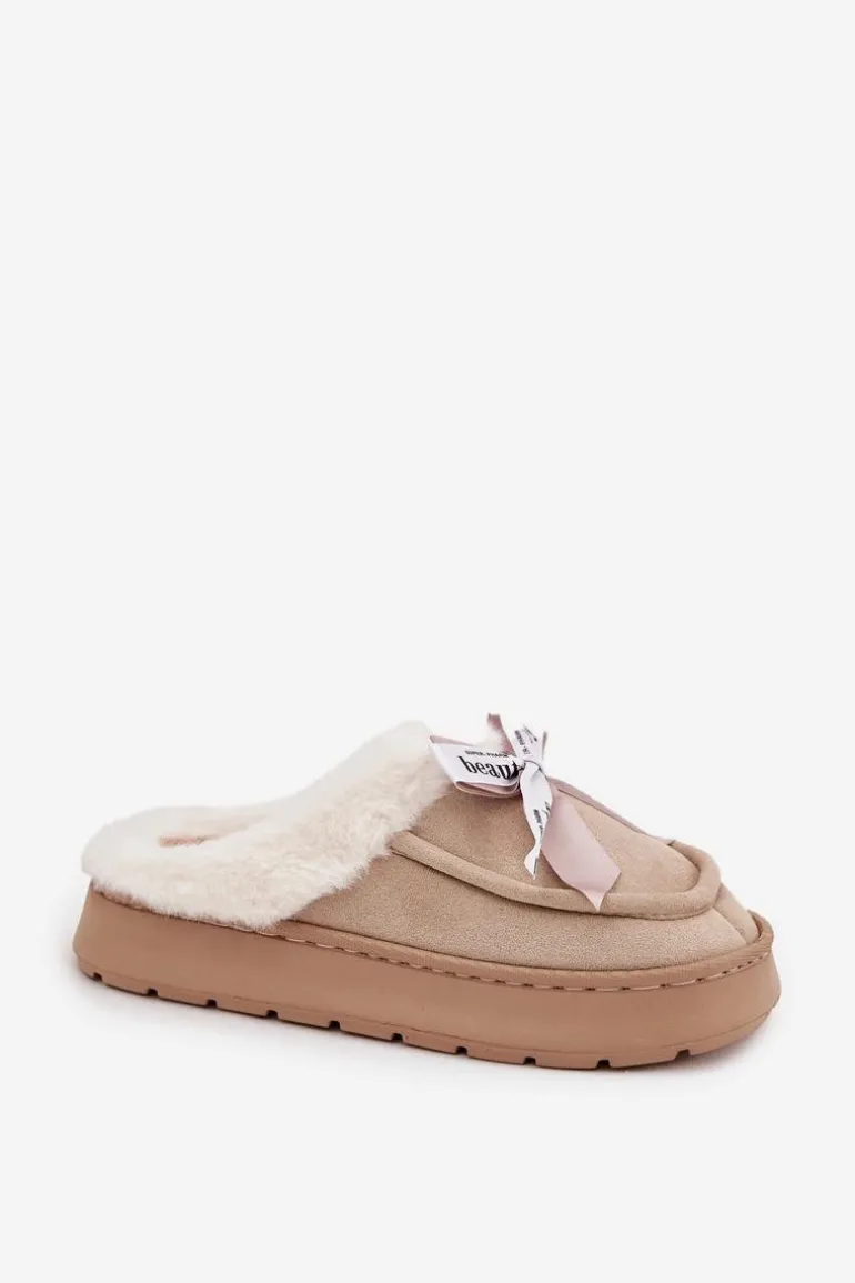 Damskie kapcie wykonane z miękkiej, eko zamszowej tkaniny. Osadzone na grubszej podeszwie zapewniają stabilność i komfort podczas chodzenia po domu. Wnętrze ocieplone puszystym futerkiem otula stopy ciepłem, sprawiając, że są idealne na chłodniejsze dni. Urocza kokardka z napisami umieszczona z przodu nadaje im dziewczęcego uroku i wyróżnia je na tle klasycznych modeli. To kapcie, które doskonale łączą praktyczność z modnym wyglądem. Przy wyborze rozmiaru prosimy sugerować się tabelą rozmiarów.