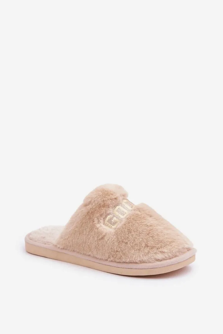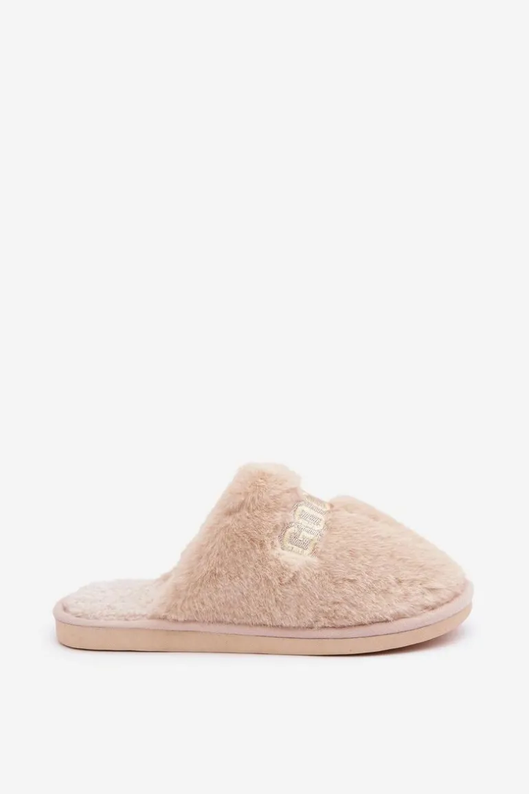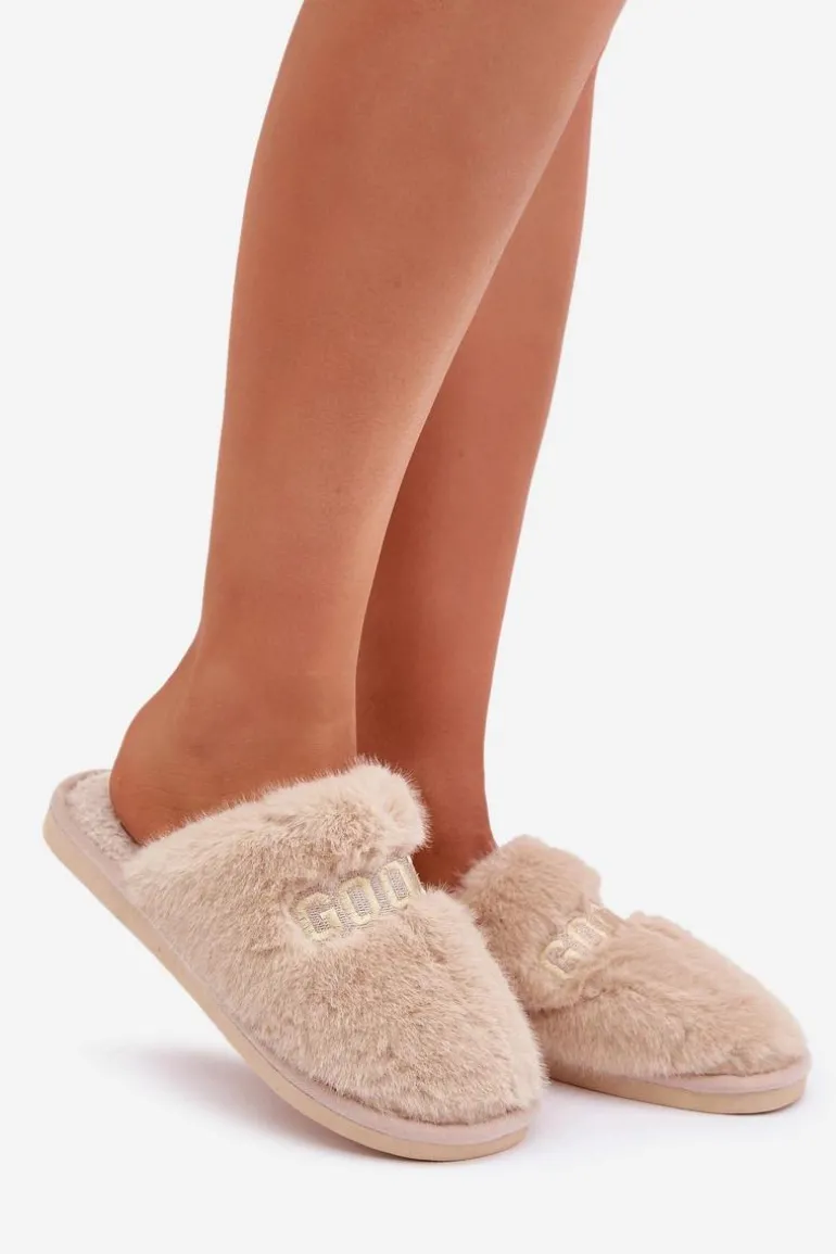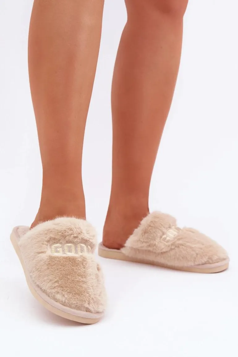 Kapcie damskie wykonane z miękkiego futerka, które zapewnia wyjątkowy komfort i ciepło. Model ozdobiony stylowym napisem, który dodaje nowoczesnego charakteru. Idealne na chłodne dni, doskonale sprawdzą się jako wygodne obuwie domowe, łącząc funkcjonalność z modnym wyglądem. Przy wyborze rozmiaru prosimy kierować tabelą rozmiarów.