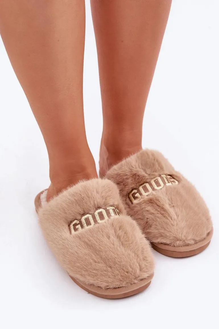 Kapcie damskie wykonane z miękkiego futerka, które zapewnia wyjątkowy komfort i ciepło. Model ozdobiony stylowym napisem, który dodaje nowoczesnego charakteru. Idealne na chłodne dni, doskonale sprawdzą się jako wygodne obuwie domowe, łącząc funkcjonalność z modnym wyglądem. Przy wyborze rozmiaru prosimy kierować tabelą rozmiarów.