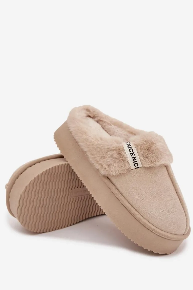 Kapcie damskie wykonane z miękkiej eko zamszowej tkaniny to idealna propozycja dla kobiet ceniących ciepło i wygodę. Model osadzony został na grubej podeszwie, która zapewnia stabilność oraz komfort podczas chodzenia po domu. Górną część ozdobiono przyjemnym w dotyku futerkiem i stylowym paseczkiem z napisem, co nadaje całości modnego i przytulnego charakteru. Wnętrze kapci zostało ocieplone, dzięki czemu doskonale chronią stopy przed chłodem. Przy wyborze rozmiaru prosimy sugerować się tabelą rozmiarów.