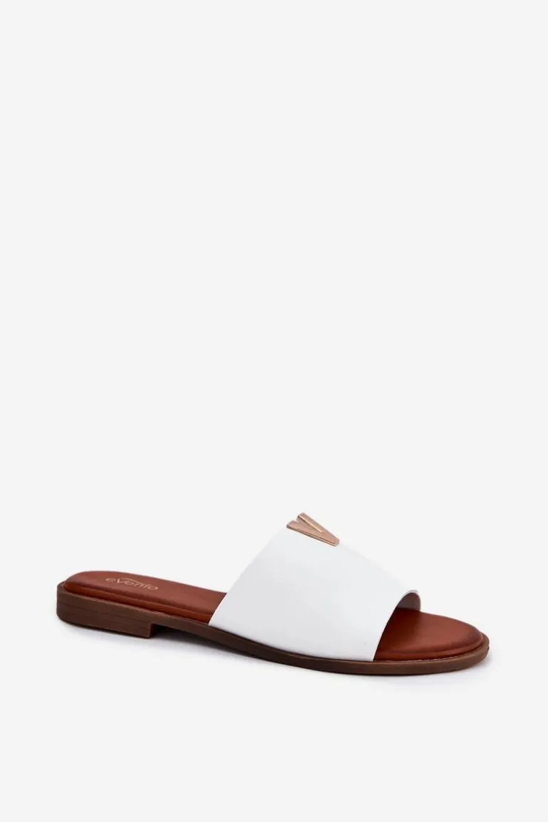 Klapki damskie wykonane ze skóry ekologicznej. Złoty element doda blasku Twojej letniej stylizacji. Osadzone na płaskim obcasie. Model ten będzie idealnym wyborem na wiele okazji! Przy wyborze rozmiaru prosimy sugerować się tabelą rozmiarów.