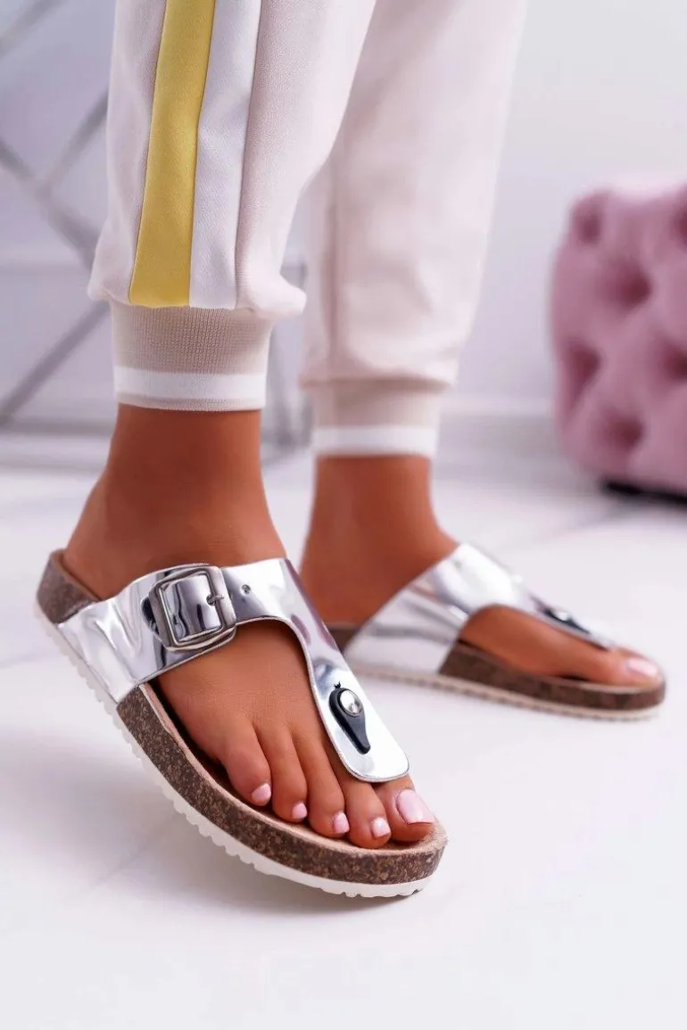 Klapki Damskie Japonki Na Korku Lakierowane Srebrne Palette
