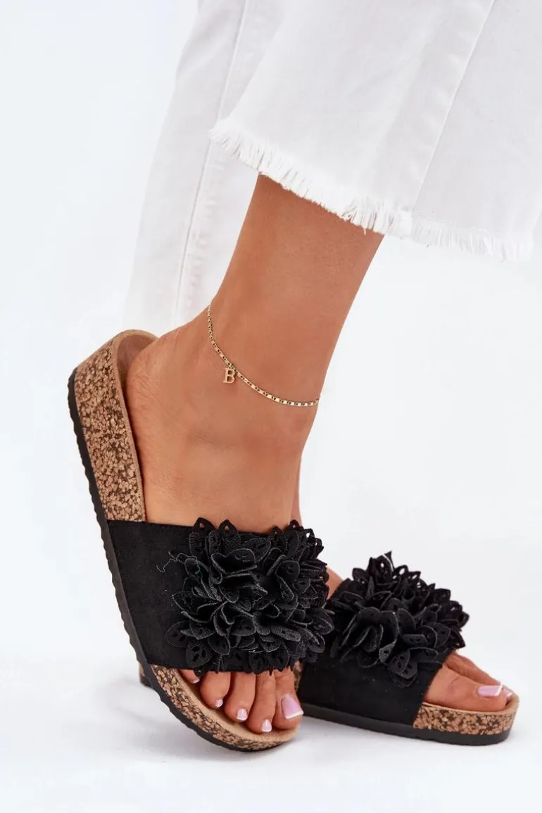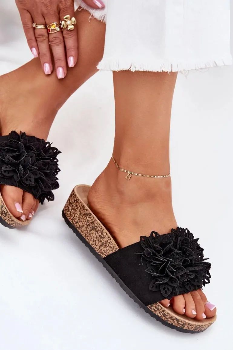 Klapki na korkowej platformie to stylowa propozycja na co dzień. Dzięki profilowanej wkładce zapewniają komfort przez cały dzień. Ozdobione materiałowymi kwiatkami na pasku, dodają uroku. Doskonałe do sukienek oraz spodni, łączą wygodę z modnym wyglądem, idealne na letnie dni. Przy wyborze rozmiaru prosimy sugerować się tabelą rozmiarów.