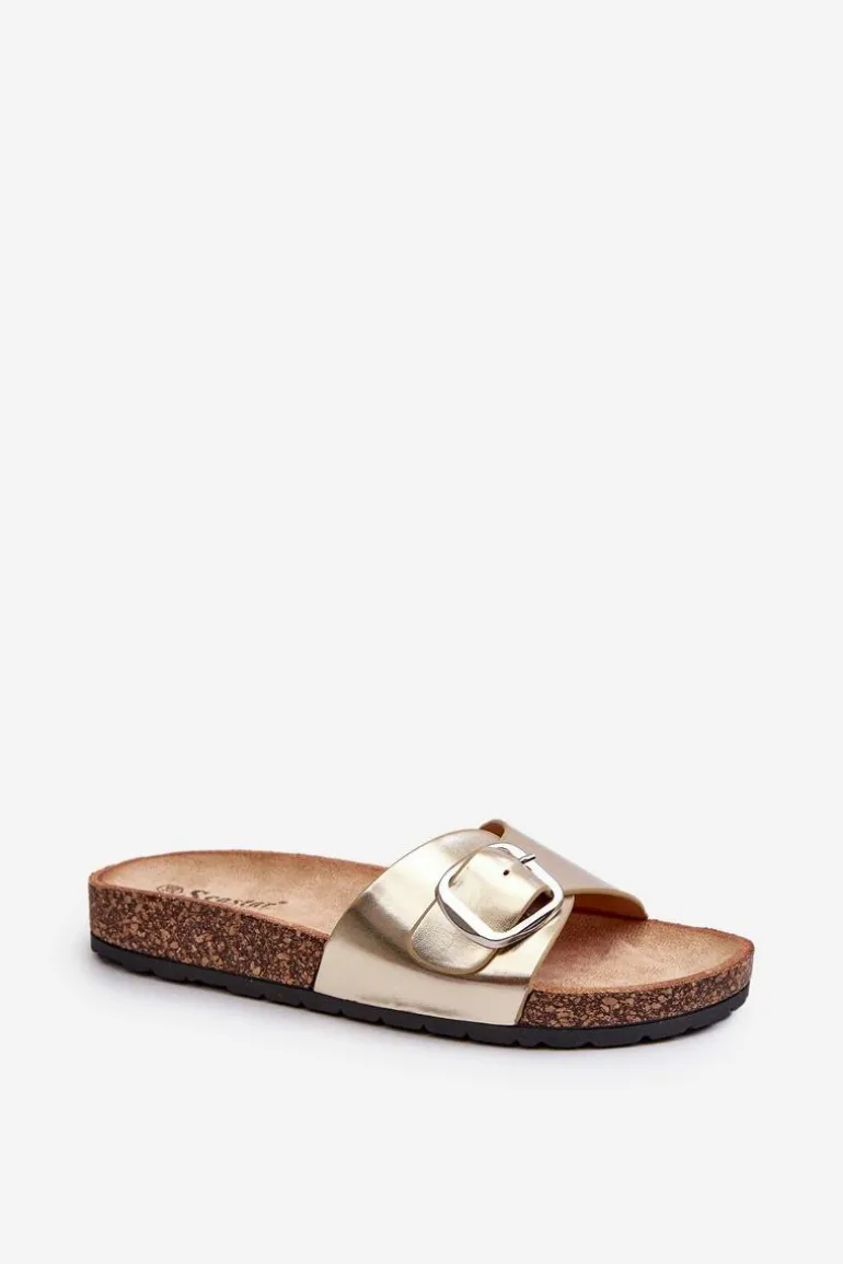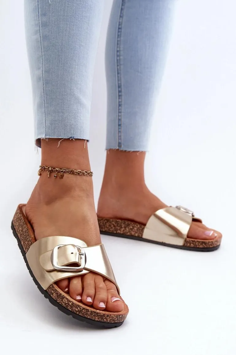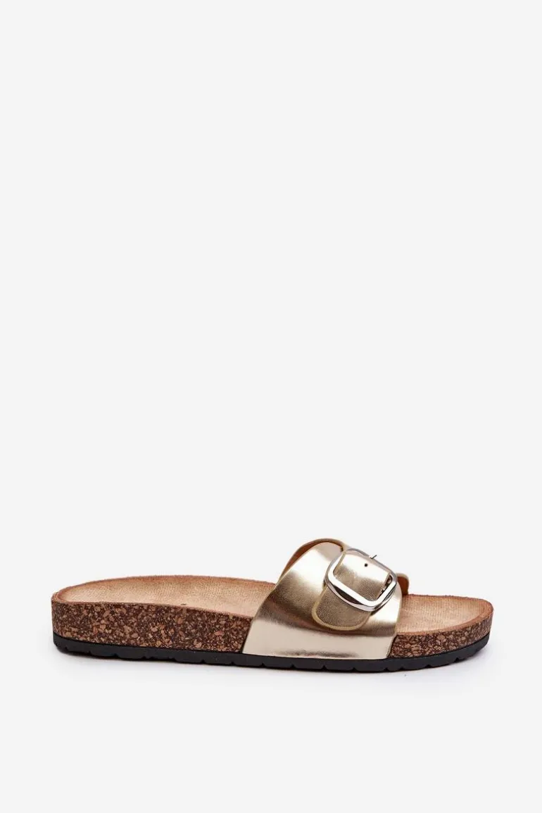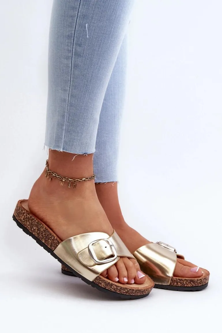 Klapki Damskie Na Korkowej Platformie Z Klamrą Złote Moaxi