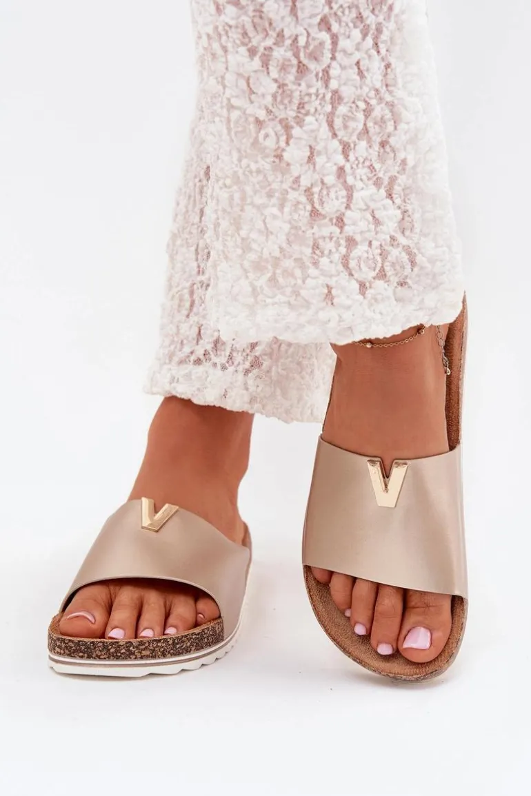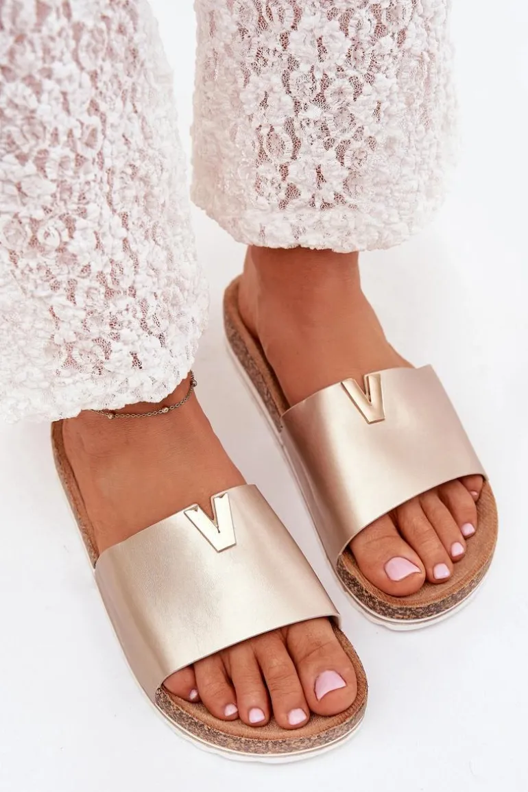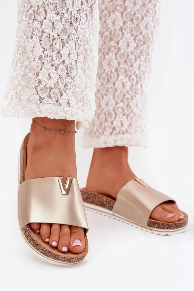 Klapki damskie z eko skóry, osadzone na korkowej platformie, to połączenie komfortu i stylu. Złoty detal w kształcie litery „V” dodaje im elegancji, a profilowana, eko zamszowa wkładka zapewnia wygodę przez cały dzień. Idealne do codziennych stylizacji, doskonale komponują się z sukienkami, spódnicami czy spodniami, łącząc funkcjonalność z modnym wyglądem. Przy wyborze rozmiaru prosimy sugerować się tabelą rozmiarów.