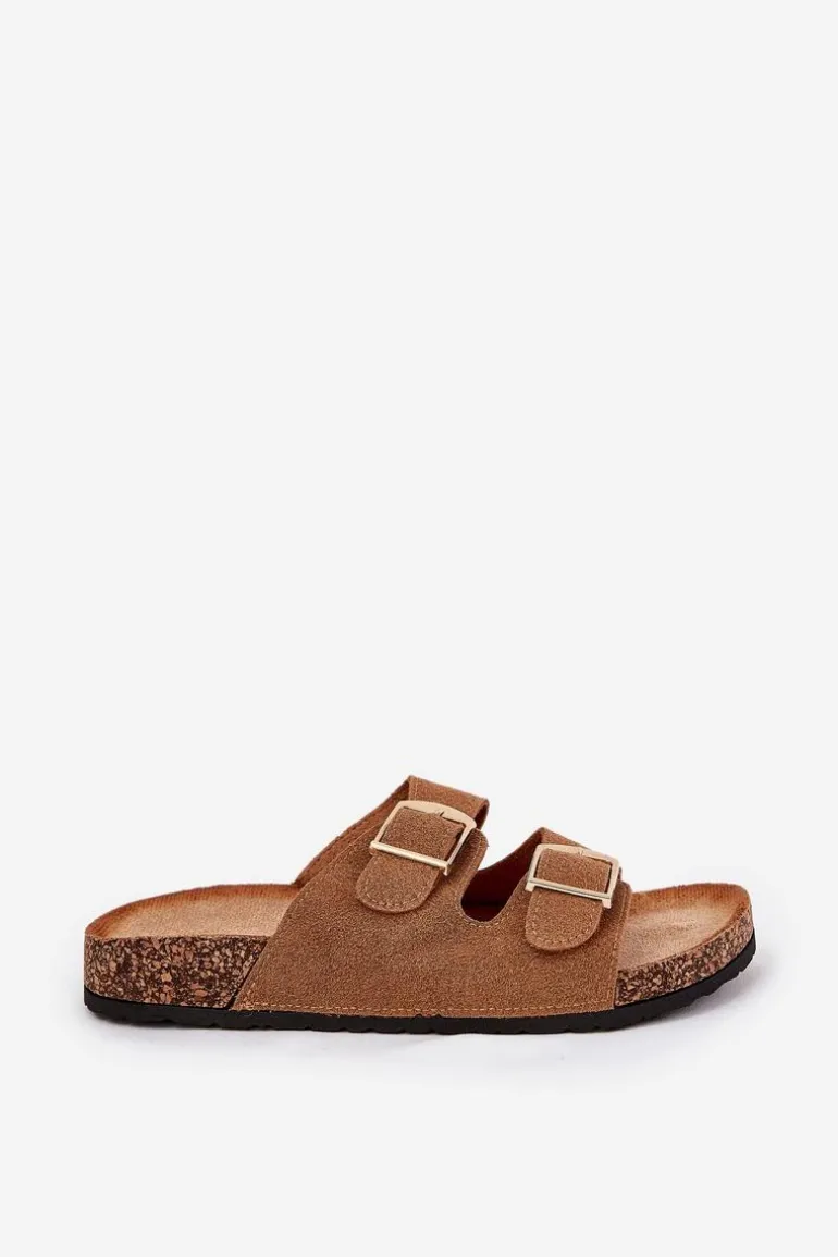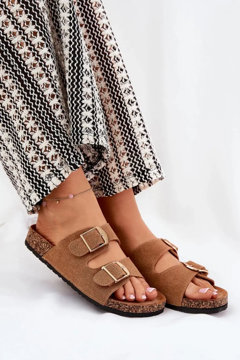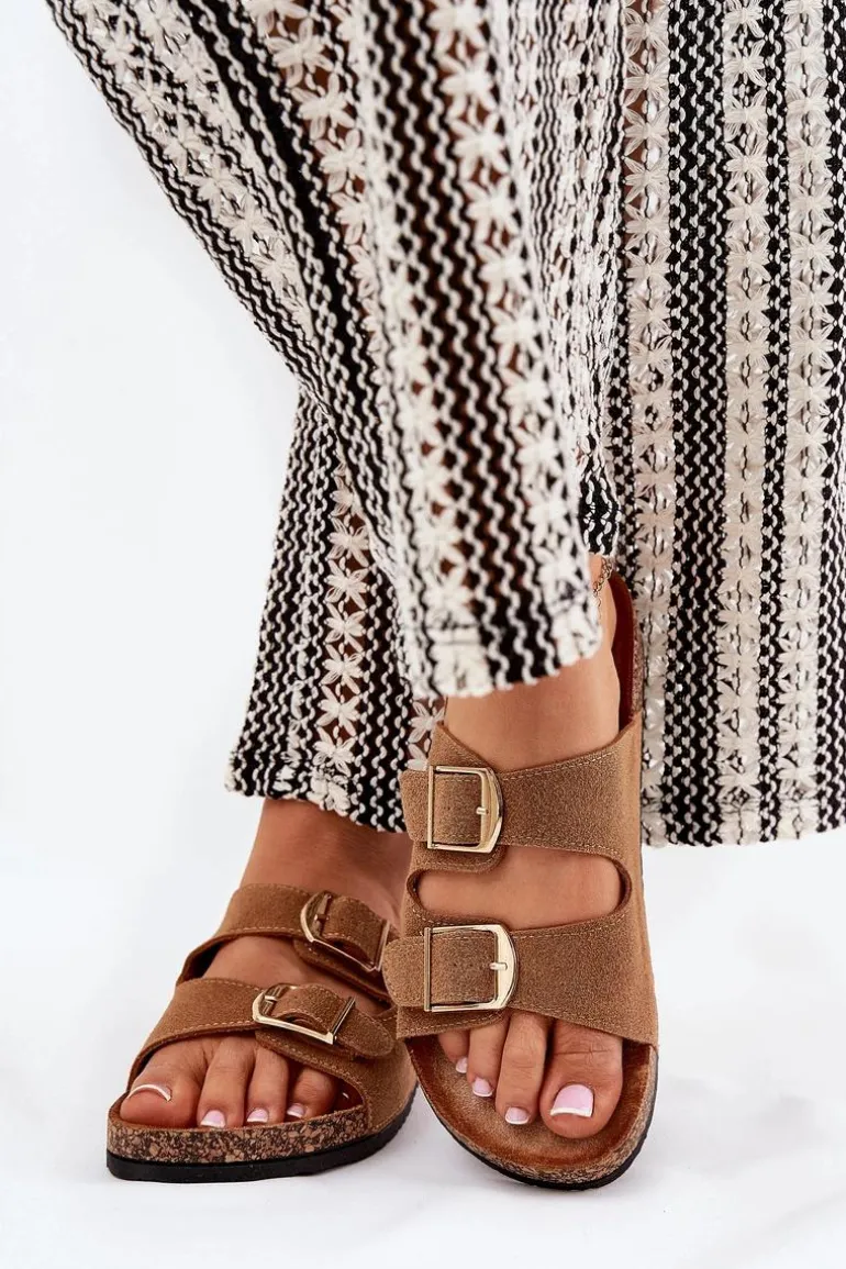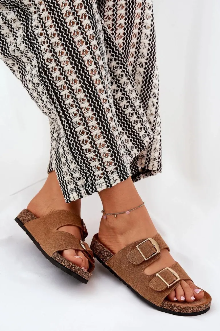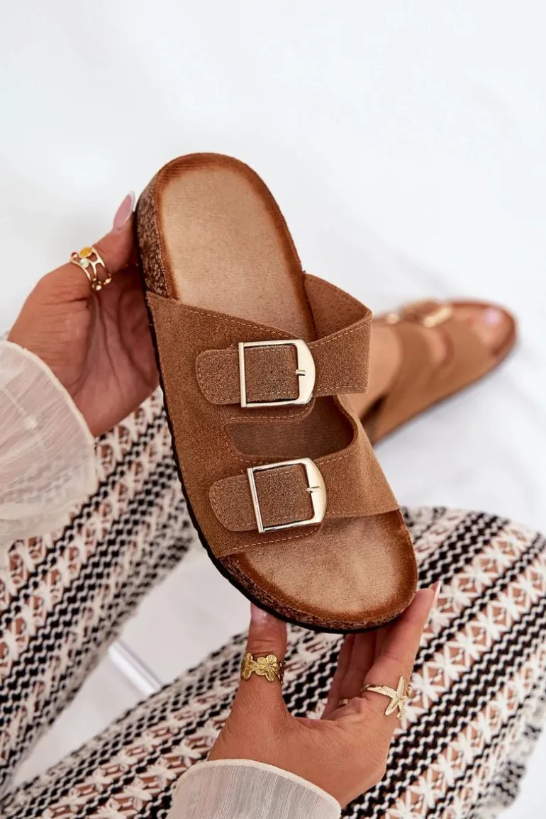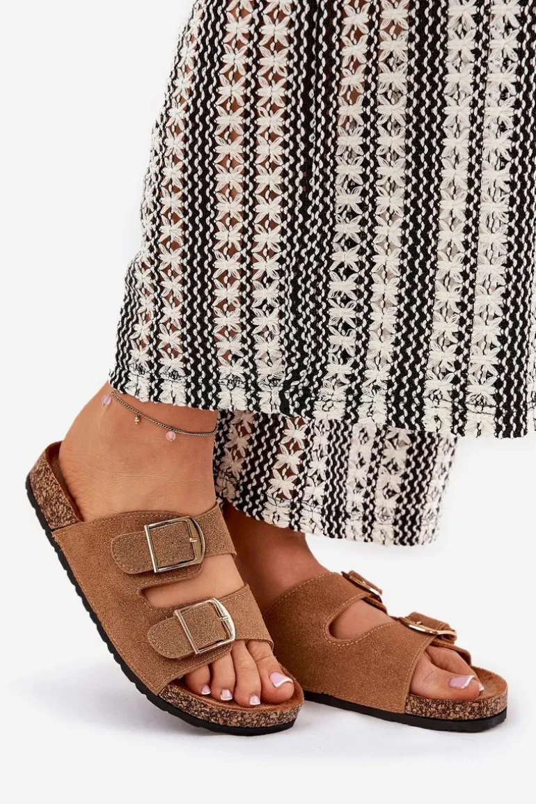 Klapki Damskie Na Korkowej Platformie Ze Złotymi Klamrami Camel Lisavionea