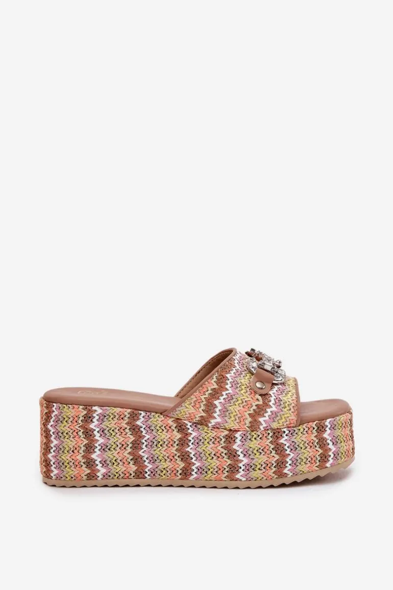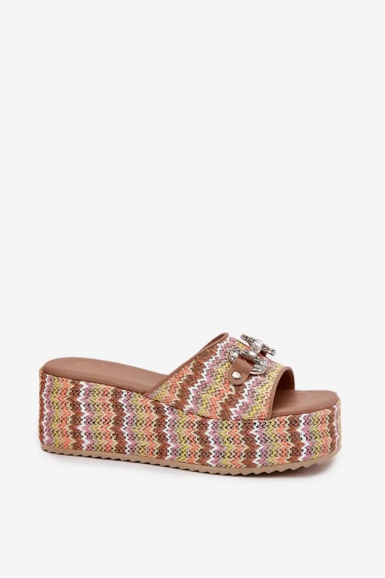 Klapki damskie z plecionką, osadzone na koturnie i platformie, to stylowa propozycja na letnie dni. Na pasku znajduje się subtelny ozdobny detal, który nadaje im wyjątkowego charakteru. Miękka wkładka zapewnia komfort noszenia przez cały dzień, a połączenie koturny i platformy gwarantuje wygodę i stabilność. Idealne do codziennych stylizacji. Przy wyborze rozmiaru prosimy kierować się tabelą rozmiarów.