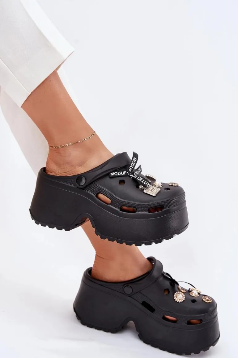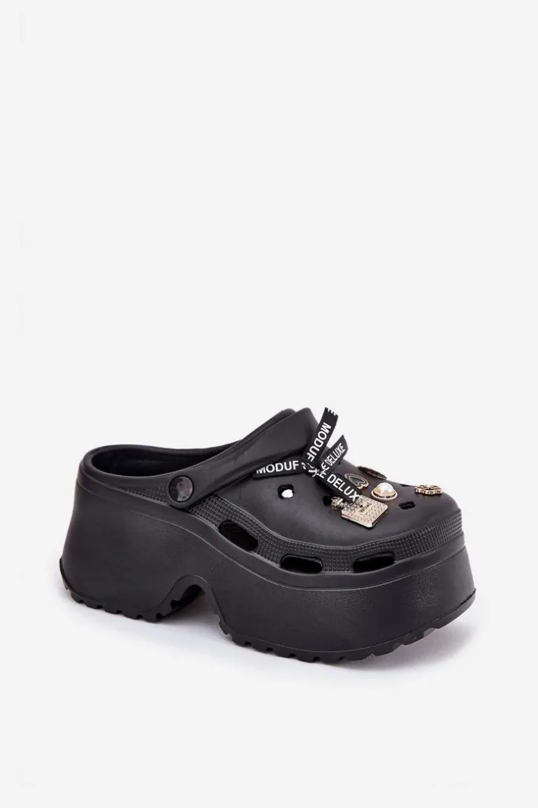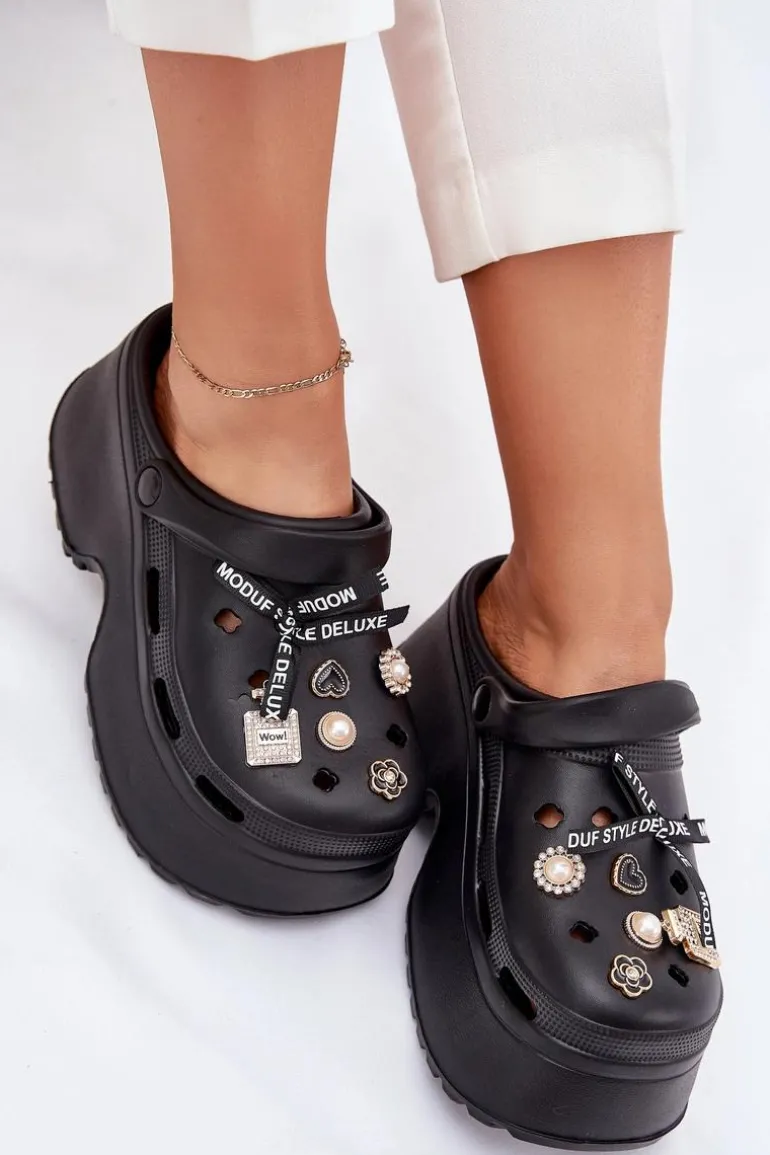 Klapki Damskie Na Masywnej Platformie Z Przypinkami Czarne Vivira