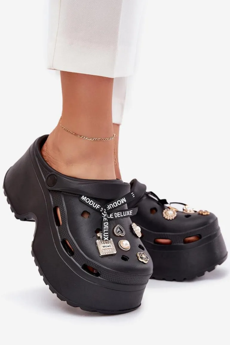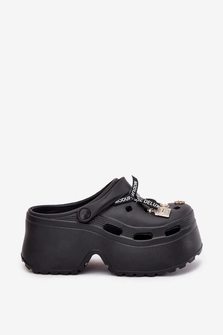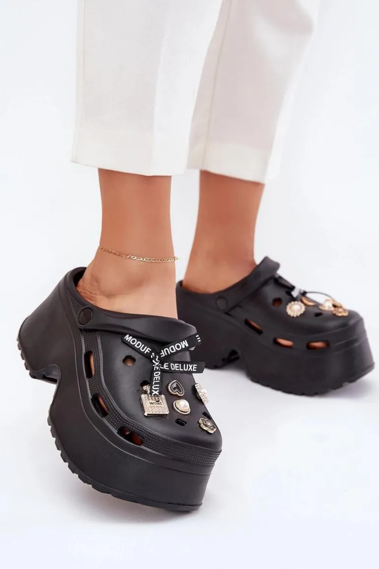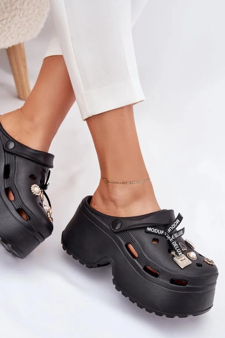 Klapki Damskie Na Masywnej Platformie Z Przypinkami Czarne Vivira