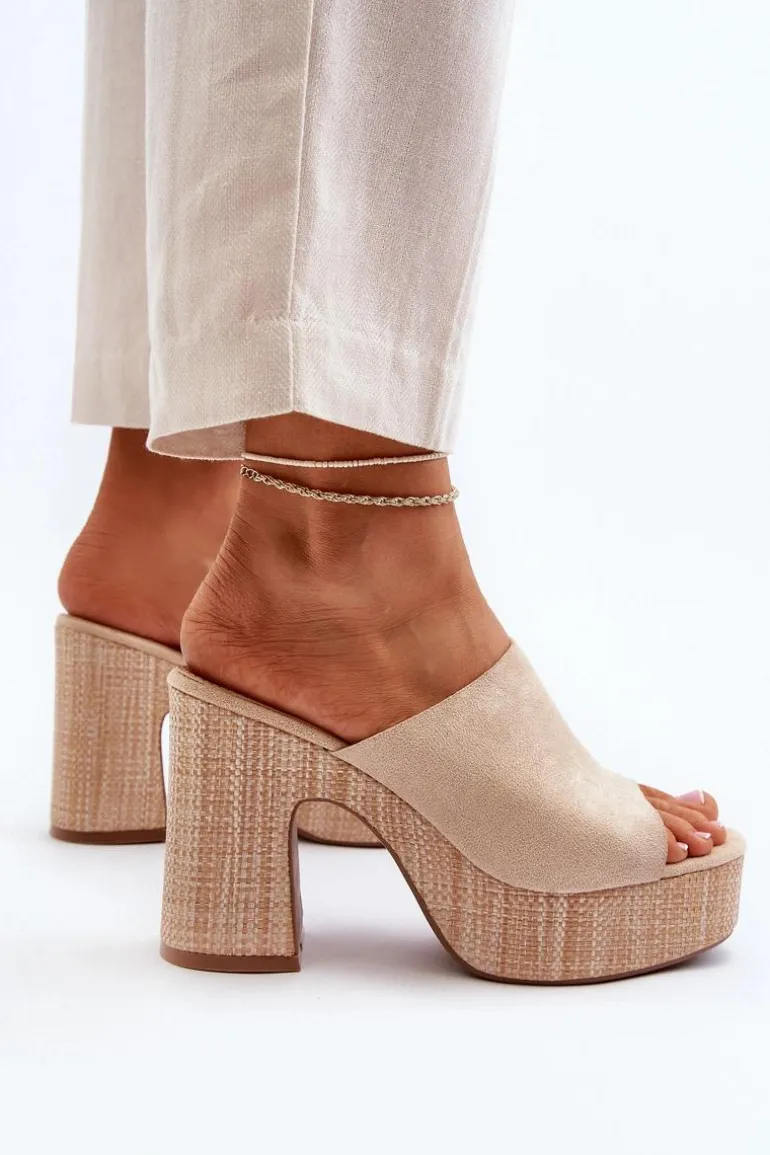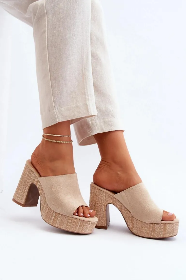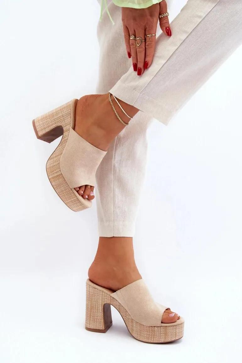Klapki Damskie Na Obcasie Słupku Beżowe Siobhan
