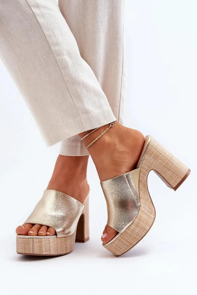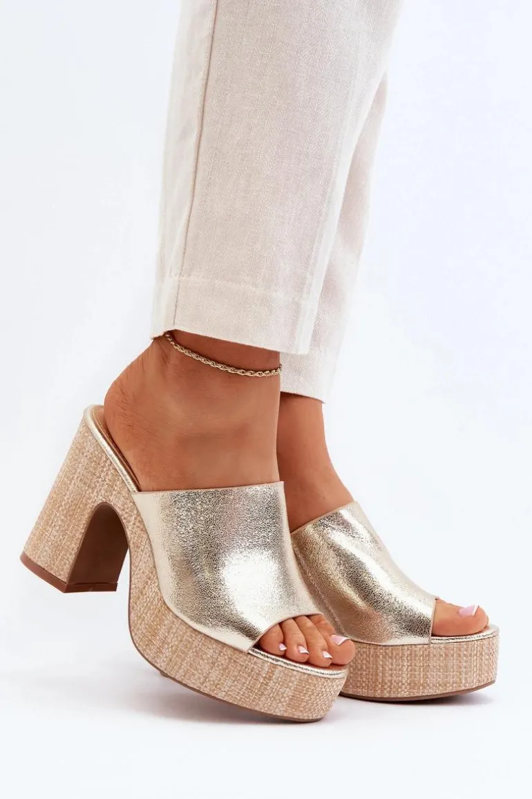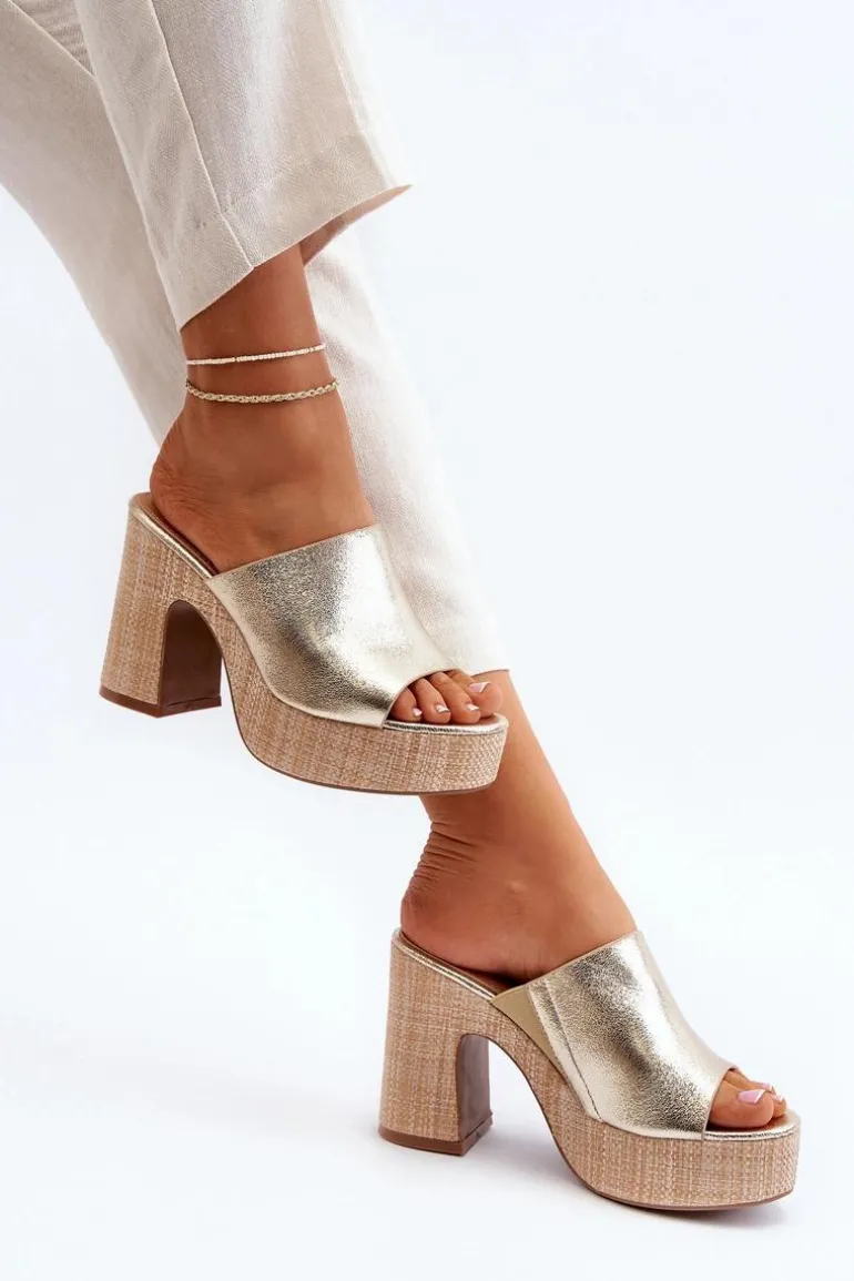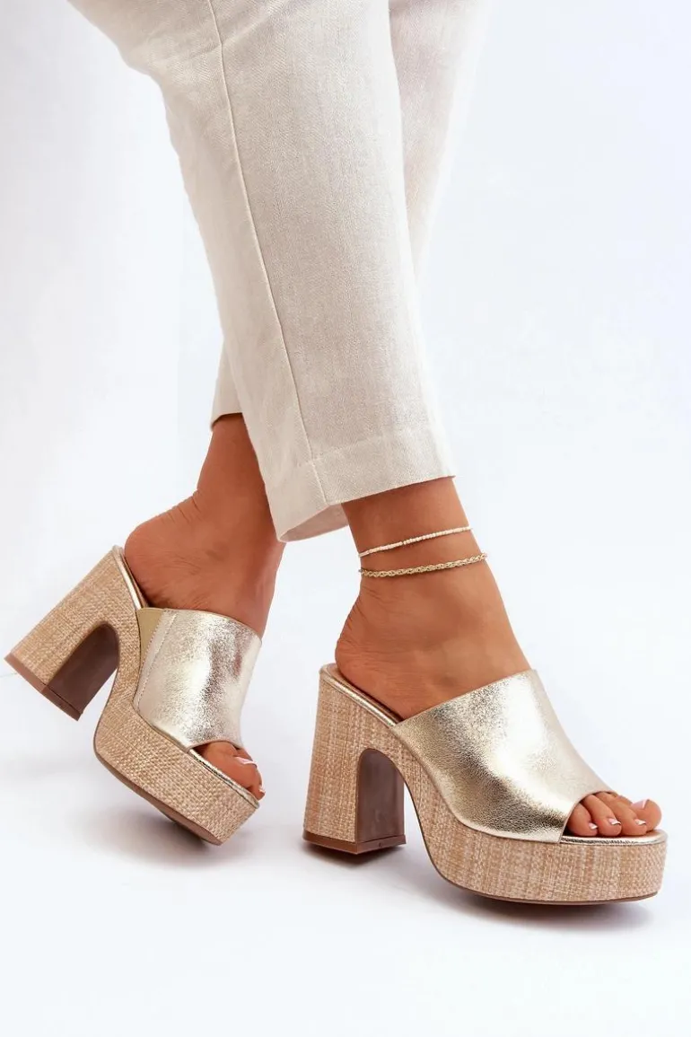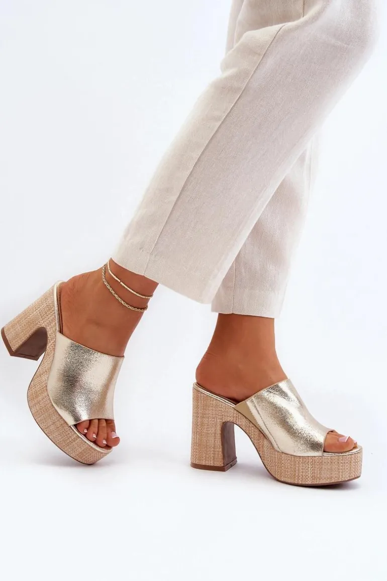 Klapki Damskie Na Obcasie Słupku Złote Siobhan